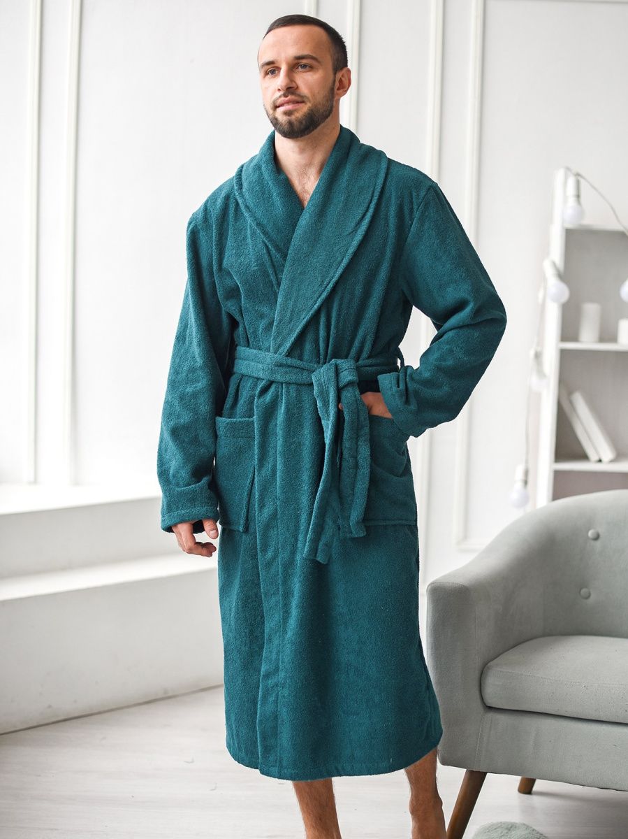 Мужской халат из двустороннего махрового хлопкового полотна. Модель на запах, с поясом в шлёвках, с боковыми карманами, с воротником "шаль", с петлей-вешалкой по горловине спинки.