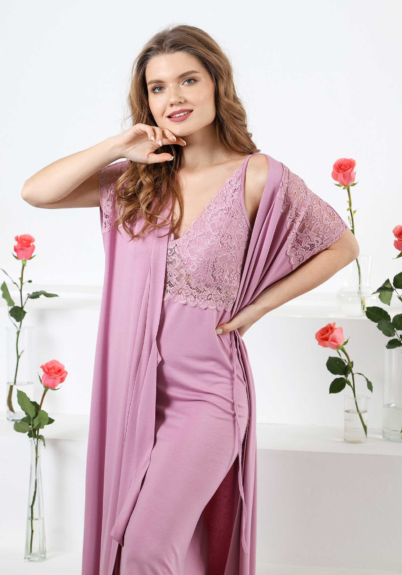 Халат из трикотажного полотна «кулирка» с набивным рисунком, на запахе, с короткими втачными рукавами, отделанными кружевом по нижним срезам. Бортовые срезы и горловина обработаны притачной планкой. Съемный пояс фиксируется на линии талии при помощи двух шлевок из окантовки в боковых швах.