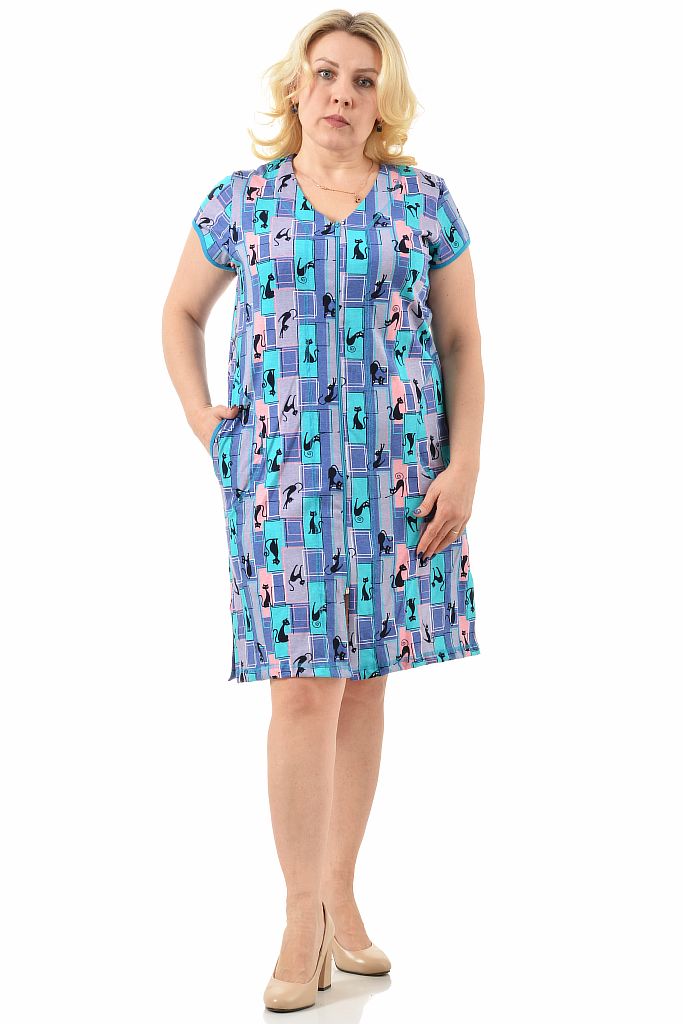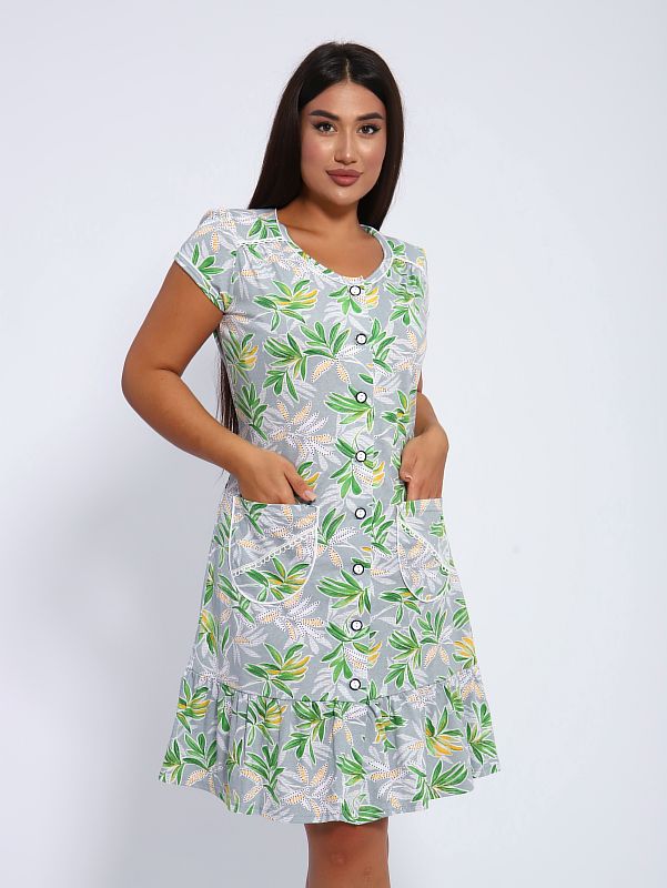 Халат из трикотажного полотна «кулирка» с набивным рисунком, прямого силуэта, с короткими втачными рукавами, горловиной овальной формы, карманами в боковых швах и центральной бортовой застежкой на тесьму «молния». Горловина и входы в карманы окантованы двойным кантом.