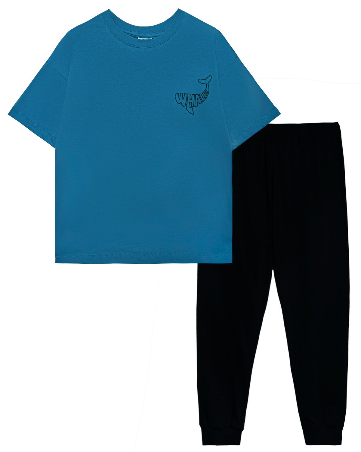 Пижама для мальчика, состоящая из футболки и брюк. Футболка свободного силуэта (оверсайз), с коротким рукавом. Горловина круглая обработана обтачкой из рибаны. Низ изделия и рукава обработан швом вподгибку. На полочке принт Шелкография. Надпись переводится как "Кит". Брюки прямого силуэта, из однотонного полотна. Пояс цельнокроенный, с эластичной тесьмой внутри. По низу изделия манжеты из рибаны.