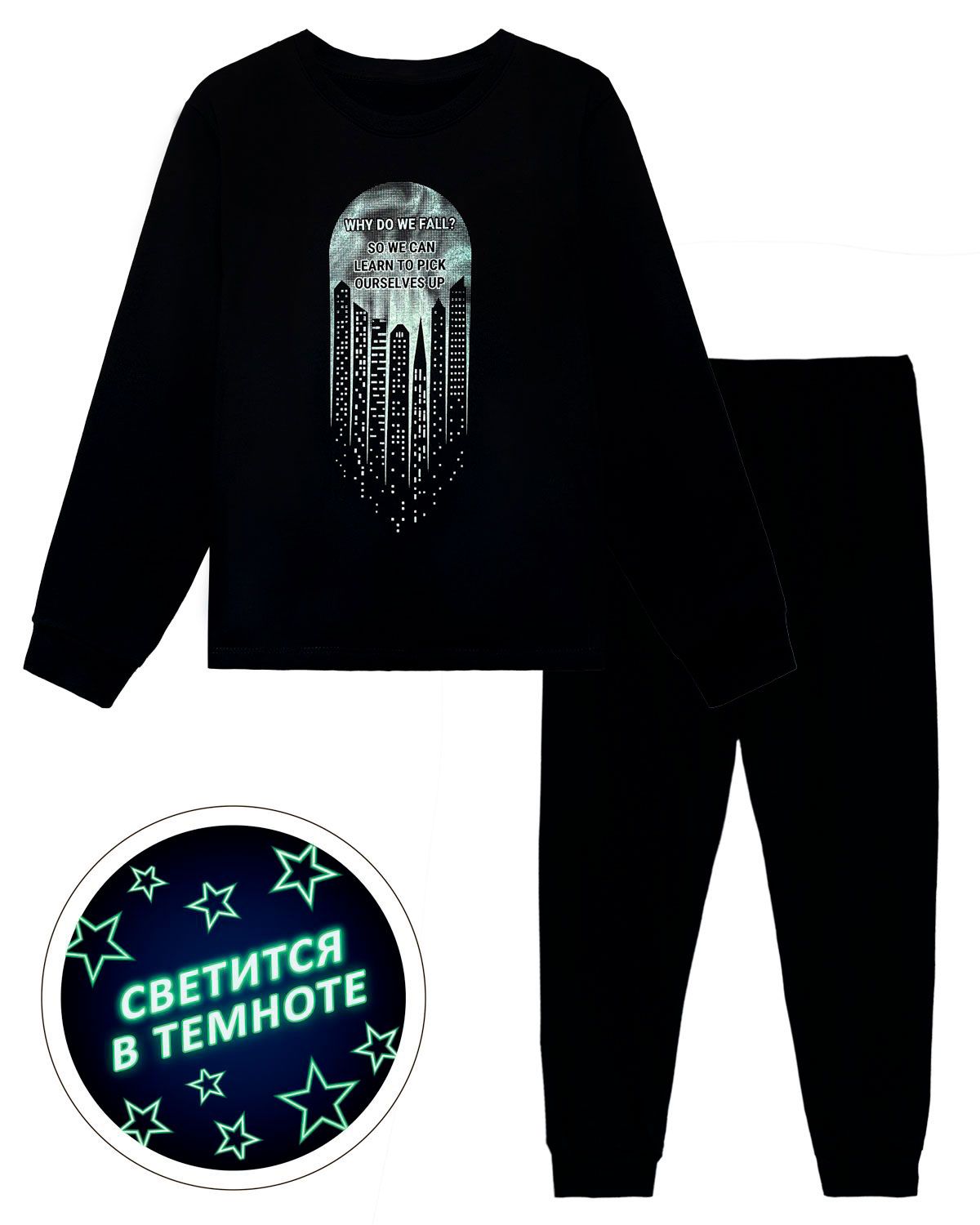 Пижама для мальчика, состоящая из джемпера и брюк. Джемпер прямого силуэта, с втачным длинным рукавом. Горловина круглая обработана обтачкой из рибаны. По низу рукавов манжеты из рибаны. Низ изделия обработан швом вподгибку. На полочке принт Шелкография с флуоресцентной краской. ПРИНТ СВЕТИТСЯ В ТЕМНОТЕ. Надпись переводится как "Почему мы падаем?;Чтобы могли научиться брать себя в руки". Брюки прямого силуэта, из однотонного полотна. Пояс цельнокроенный, с эластичной тесьмой внутри. По низу изделия манжеты из рибаны.