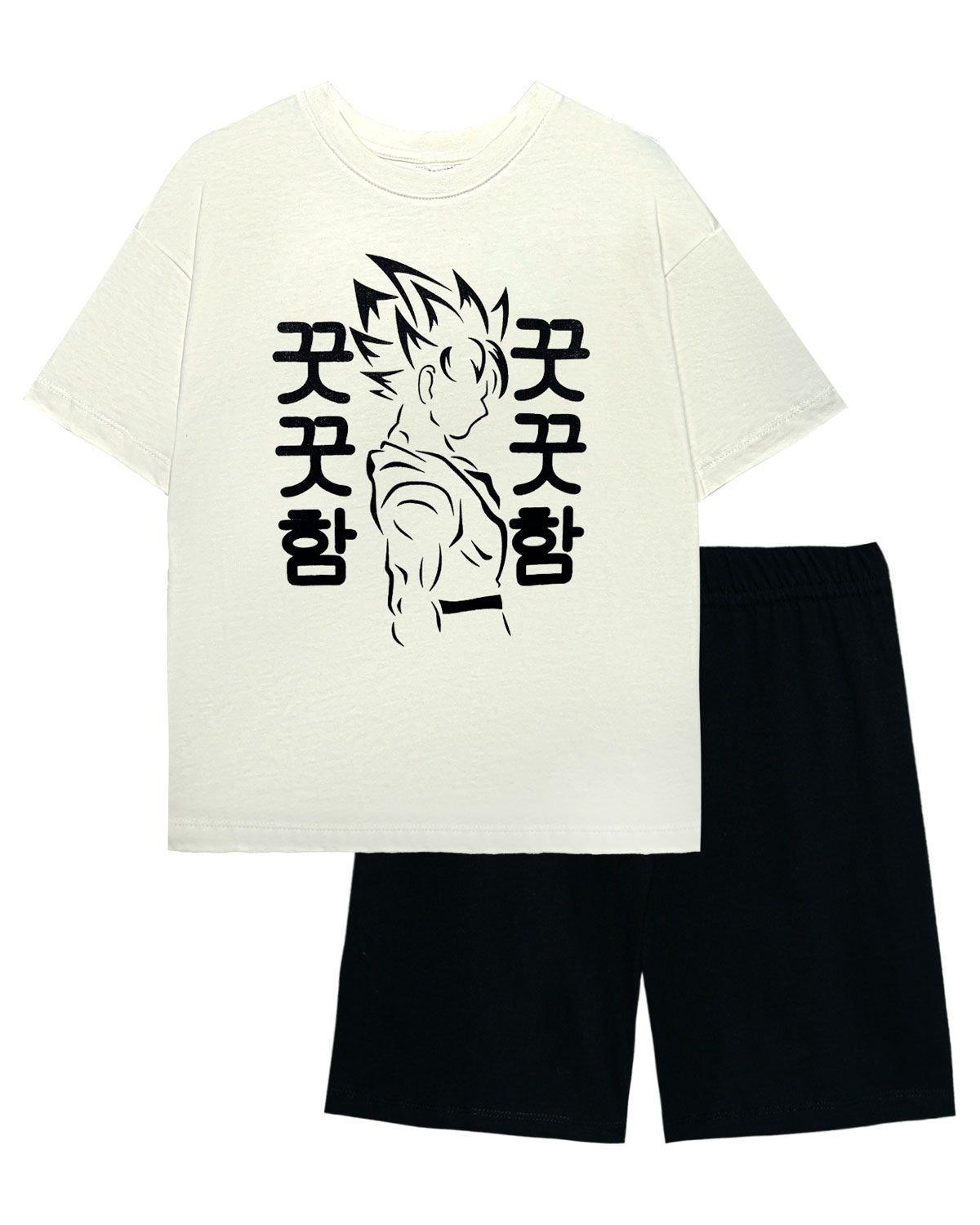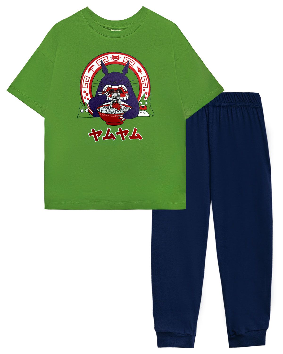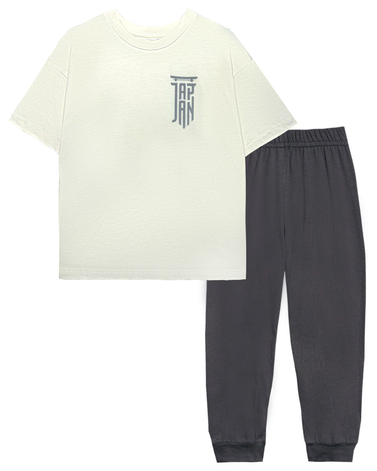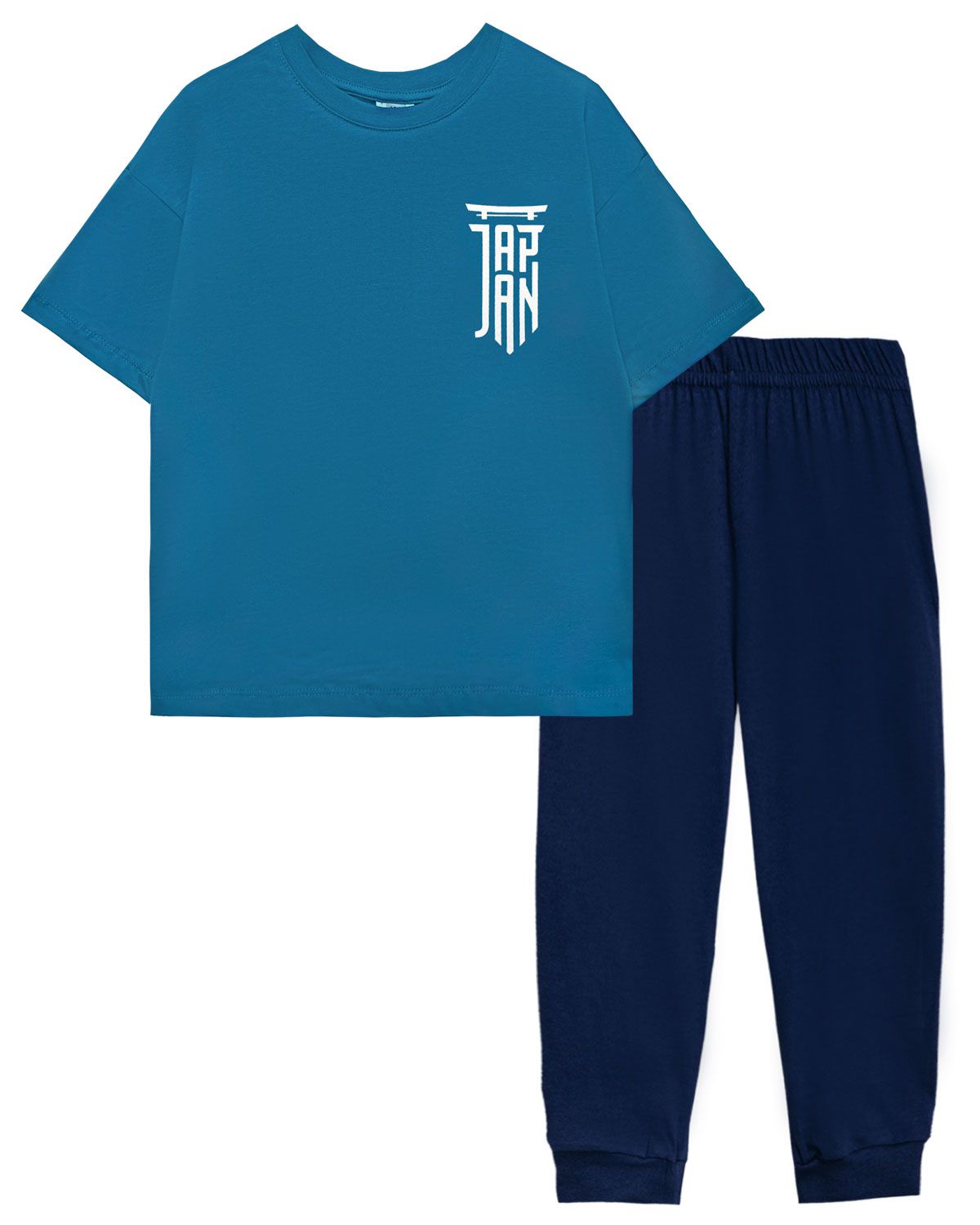 Пижама для мальчика, состоящая из футболки и брюк. Футболка свободного силуэта (оверсайз), с коротким рукавом. Горловина круглая обработана обтачкой из рибаны. Низ изделия и рукава обработан швом вподгибку. На полочке принт Шелкография. Надпись переводится как "Япония". Брюки прямого силуэта, из однотонного полотна. Пояс цельнокроенный, с эластичной тесьмой внутри. По низу изделия манжеты из рибаны.
