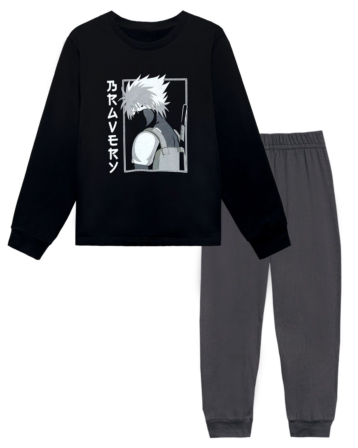 Пижама для мальчика, состоящая из джемпера и брюк. Джемпер прямого силуэта, с втачным длинным рукавом. Горловина круглая обработана обтачкой из рибаны. По низу рукавов манжеты из рибаны. Низ изделия обработан швом вподгибку. На полочке принт Шелкография. Надпись переводится как "Храбрость". Брюки прямого силуэта, из однотонного полотна. Пояс цельнокроенный, с эластичной тесьмой внутри. По низу изделия манжеты из рибаны.