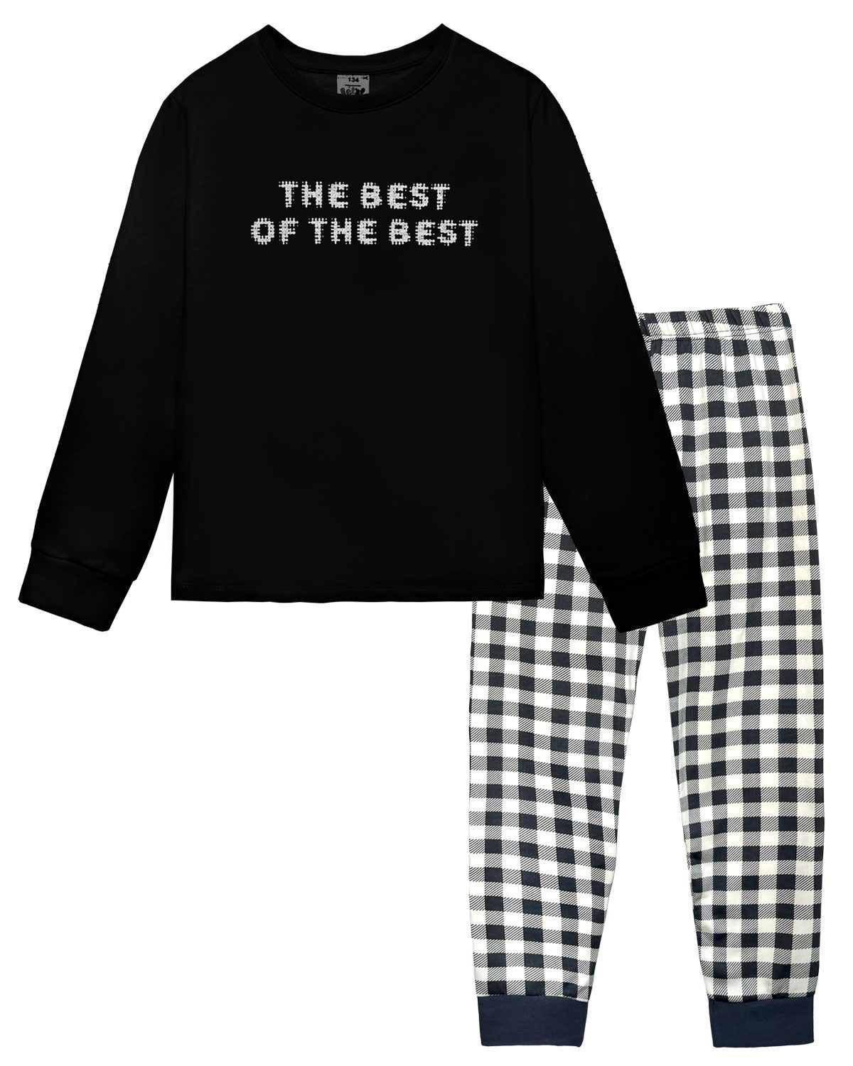 Пижама для мальчика, состоящая из джемпера и брюк. Джемпер прямого силуэта, с втачным длинным рукавом. Горловина круглая обработана обтачкой из рибаны. По низу рукавов манжеты из рибаны. Низ изделия обработан швом вподгибку. На полочке принт Шелкография. Надпись переводится как "Лучший из лучших". Брюки прямого силуэта, из набивного полотна. Пояс цельнокроенный, с эластичной тесьмой внутри. По низу изделия манжеты из рибаны.