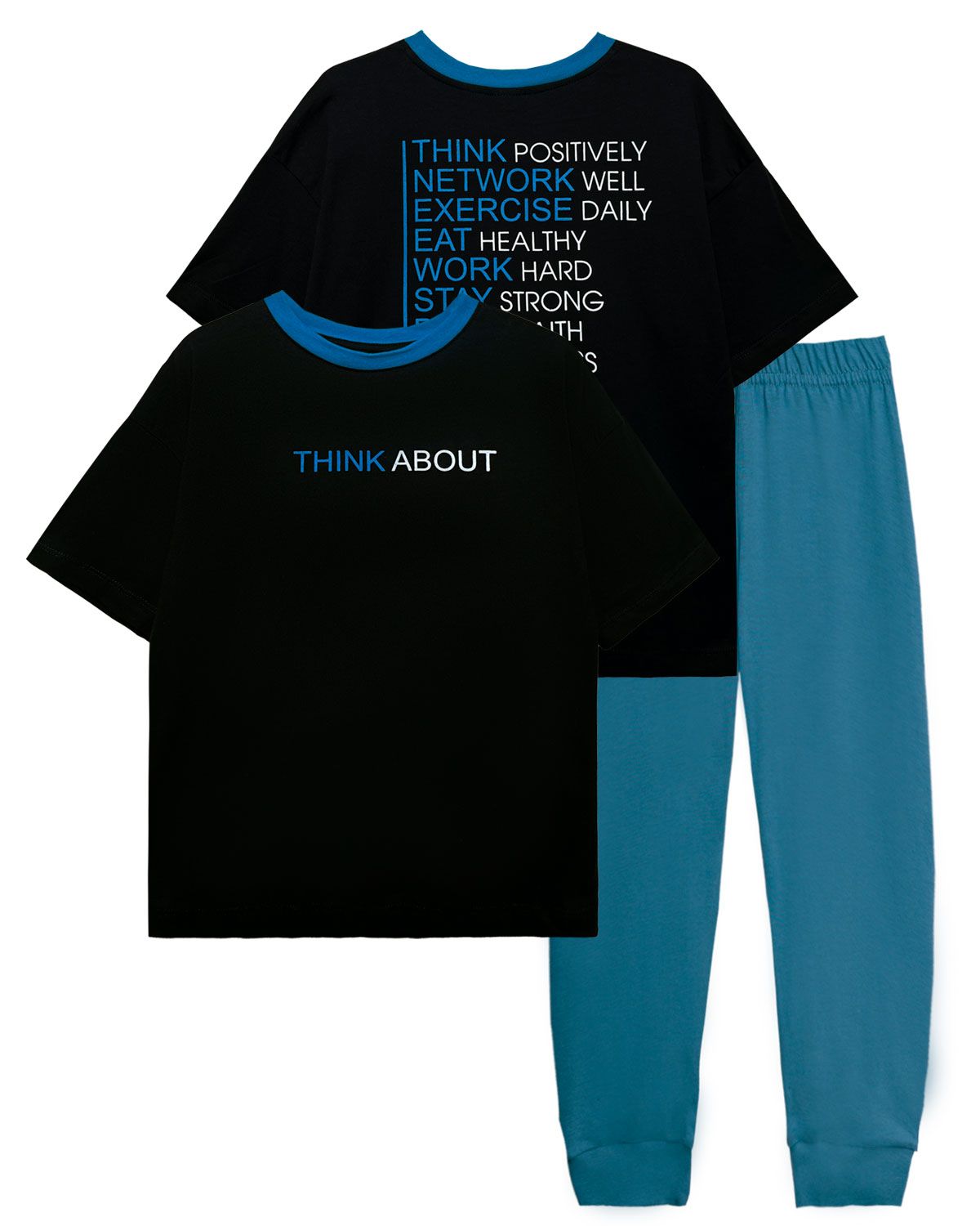 Пижама для мальчика, состоящая из футболки и брюк. Футболка свободного силуэта (оверсайз), с коротким рукавом. Горловина круглая обработана обтачкой из рибаны. Низ изделия и рукава обработан швом вподгибку. На полочке и спинке принт Шелкография. Надпись переводится как "Думайте;Думайте о хорошем;Хорошо общайтесь;Занимайтесь спорто каждый день;Питайтесь здоровой пищей;Усердно работайте;Оставайтесь сильными;Укрепляйте веру; Меньше беспокойтесь;Больше читайте; Будьте счастливы;Чаще отдыхайте;Всегда любите;Живите вечно". Брюки прямого силуэта, из однотонного полотна. Пояс цельнокроенный, с эластичной тесьмой внутри. По низу изделия манжеты из рибаны.