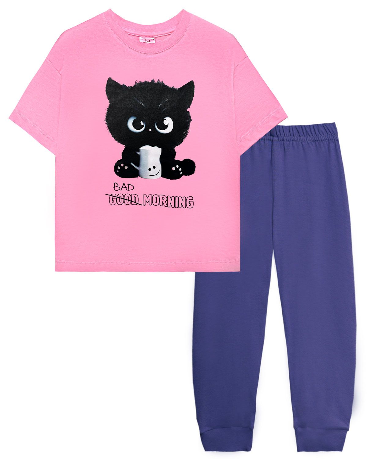 Пижама для девочки, состоящая из футболки и брюк. Футболка свободного силуэта (оверсайз), с коротким рукавом. Горловина круглая обработана обтачкой из рибаны. Низ изделия и рукава обработан швом вподгибку. На полочке Фотопринт. Надпись переводится как "Хорошее/Плохое утро". Брюки прямого силуэта, из однотонного полотна. Пояс цельнокроенный, с эластичной тесьмой внутри. По низу изделия манжеты из рибаны.