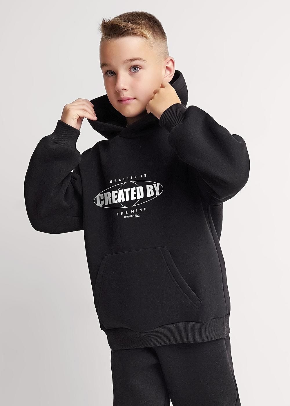 Мягкое тёплое худи из футера с начёсом идально подойдёт для прогулок в прохладную погоду. Модель дополнена уютным капюшоном, накладным карманом и стильным принтом. Худи отлично подойдёт для создания стильного и практичного образа на каждый день!