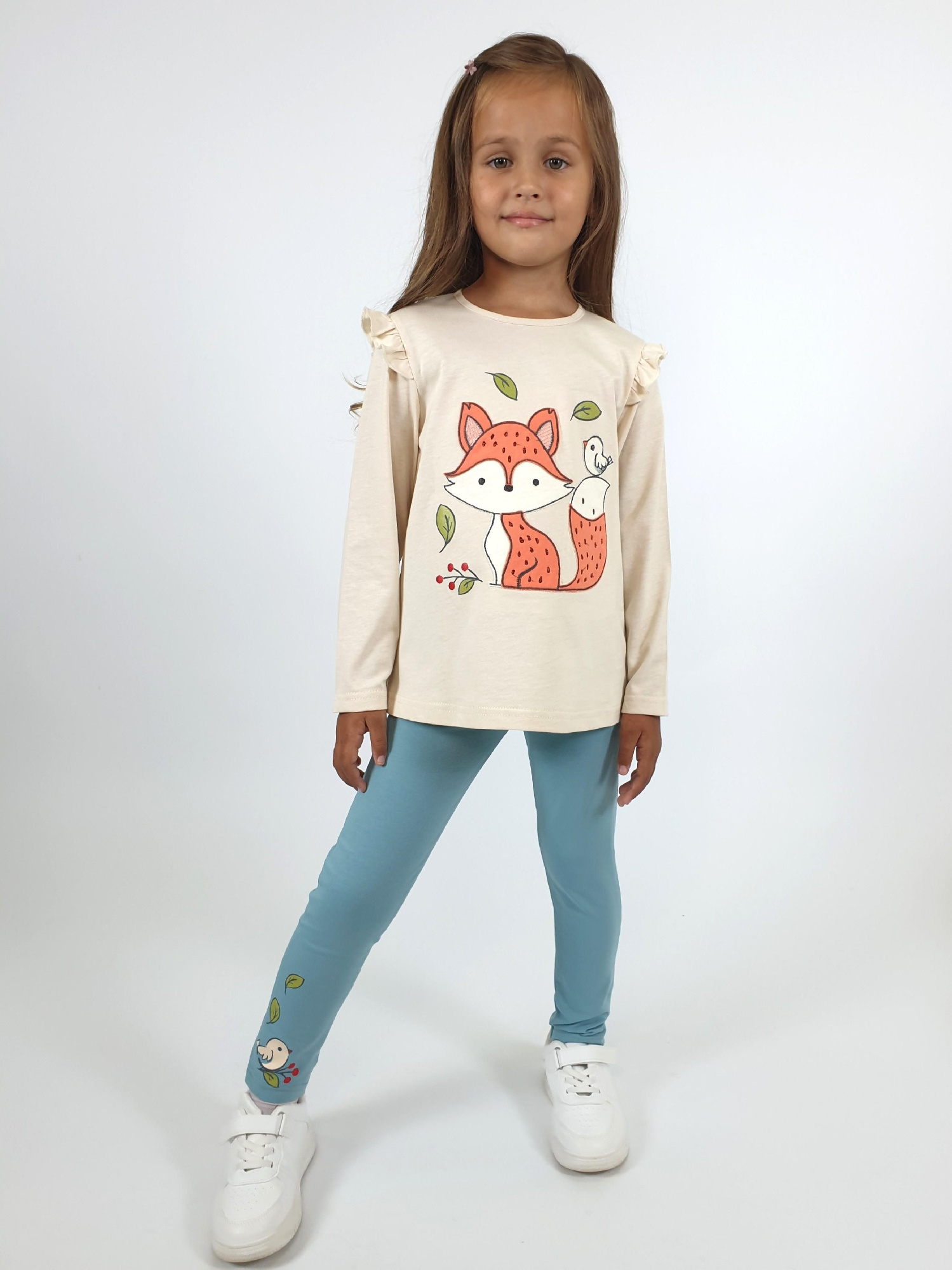 Пижама для девочки, состоящая из джемпера и брюк. Джемпер прямого силуэта, с втачным длинным рукавом. Горловина круглая обработана обтачкой из рибаны. По низу рукавов манжеты из рибаны. Низ изделия обработан швом вподгибку. На полочке принт Шелкография. Надпись переводится как "Красивая, милая". Брюки прямого силуэта, из однотонного полотна. Пояс цельнокроенный, с эластичной тесьмой внутри. По низу изделия манжеты из рибаны.