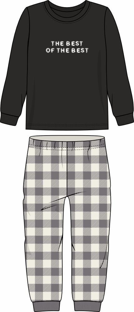 Пижама для мальчика, состоящая из джемпера и брюк. Джемпер прямого силуэта, с втачным длинным рукавом. Горловина круглая обработана обтачкой из рибаны. По низу рукавов манжеты из рибаны. Низ изделия обработан швом вподгибку. На полочке принт Шелкография. Надпись переводится как "Лучший из лучших". Брюки прямого силуэта, из набивного полотна. Пояс цельнокроенный, с эластичной тесьмой внутри. По низу изделия манжеты из рибаны.