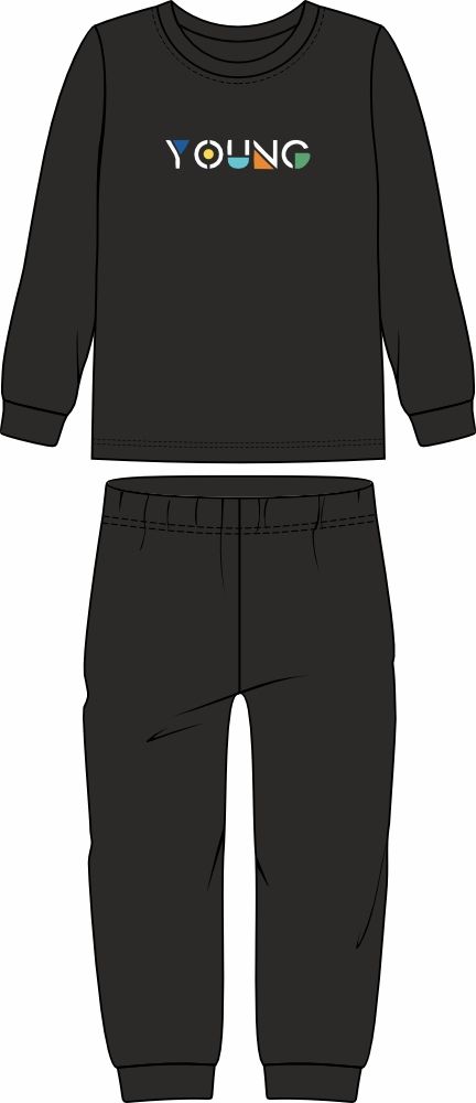 Пижама для мальчика, состоящая из джемпера и брюк. Джемпер прямого силуэта, с втачным длинным рукавом. Горловина круглая обработана обтачкой из рибаны. По низу рукавов манжеты из рибаны. Низ изделия обработан швом вподгибку. На полочке принт Шелкография. Надпись переводится как "Молодой". Брюки прямого силуэта, из однотонного полотна. Пояс цельнокроенный, с эластичной тесьмой внутри. По низу изделия манжеты из рибаны.