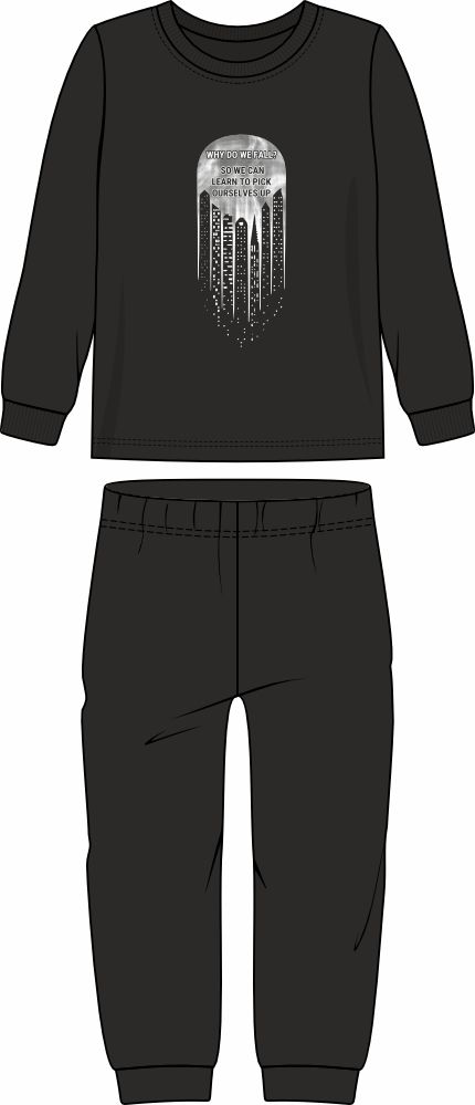 Пижама для мальчика, состоящая из джемпера и брюк. Джемпер прямого силуэта, с втачным длинным рукавом. Горловина круглая обработана обтачкой из рибаны. По низу рукавов манжеты из рибаны. Низ изделия обработан швом вподгибку. На полочке принт Шелкография с флуоресцентной краской. ПРИНТ СВЕТИТСЯ В ТЕМНОТЕ. Надпись переводится как "Почему мы падаем?;Чтобы могли научиться брать себя в руки". Брюки прямого силуэта, из однотонного полотна. Пояс цельнокроенный, с эластичной тесьмой внутри. По низу изделия манжеты из рибаны.