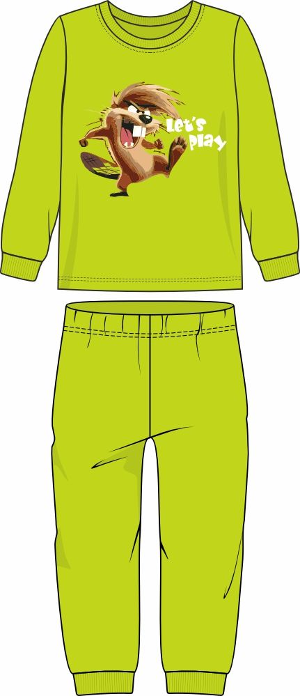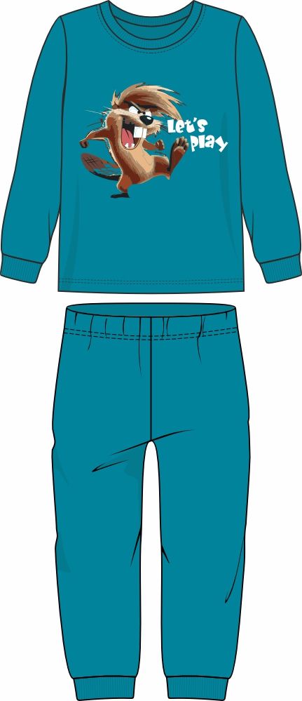 Пижама для мальчика, состоящая из джемпера и брюк. Джемпер прямого силуэта, с втачным длинным рукавом. Горловина круглая обработана обтачкой из рибаны. По низу рукавов манжеты из рибаны. Низ изделия обработан швом вподгибку. На полочке Фотопринт. Надпись переводится как "Вперед играть". Брюки прямого силуэта, из однотонного полотна. Пояс цельнокроенный, с эластичной тесьмой внутри. По низу изделия манжеты из рибаны.