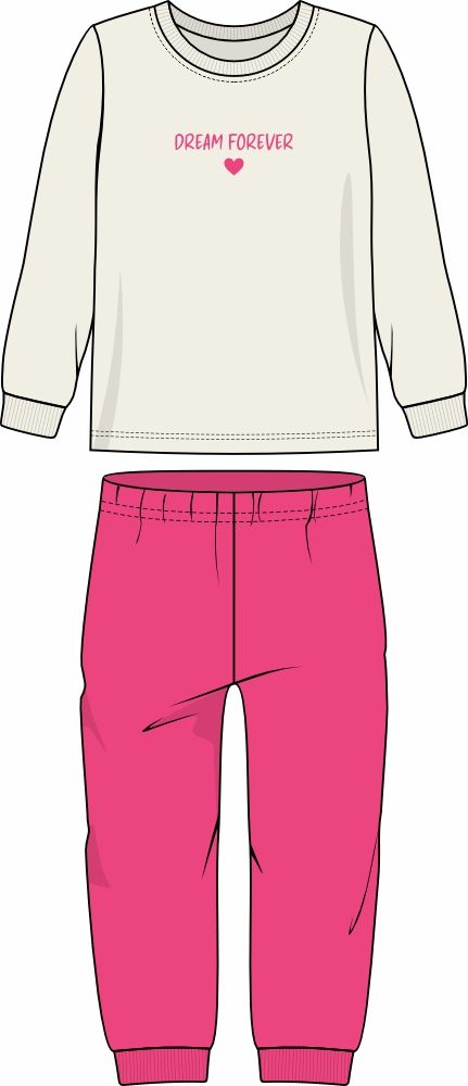 Пижама для девочки, состоящая из джемпера и брюк. Джемпер прямого силуэта, с втачным длинным рукавом. Горловина круглая обработана обтачкой из рибаны. По низу рукавов манжеты из рибаны. Низ изделия обработан швом вподгибку. На полочке принт Шелкография. Надпись переводится как "Вечно мечтать". Брюки прямого силуэта, из однотонного полотна. Пояс цельнокроенный, с эластичной тесьмой внутри. По низу изделия манжеты из рибаны.