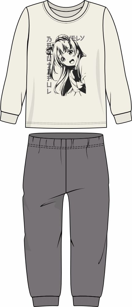 Пижама для девочки, состоящая из джемпера и брюк. Джемпер прямого силуэта, с втачным длинным рукавом. Горловина круглая обработана обтачкой из рибаны. По низу рукавов манжеты из рибаны. Низ изделия обработан швом вподгибку. На полочке принт Шелкография. Надпись переводится как "Красивая, милая". Брюки прямого силуэта, из однотонного полотна. Пояс цельнокроенный, с эластичной тесьмой внутри. По низу изделия манжеты из рибаны.