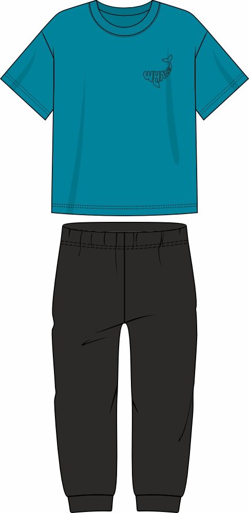 Пижама для мальчика, состоящая из футболки и брюк. Футболка свободного силуэта (оверсайз), с коротким рукавом. Горловина круглая обработана обтачкой из рибаны. Низ изделия и рукава обработан швом вподгибку. На полочке принт Шелкография. Надпись переводится как "Кит". Брюки прямого силуэта, из однотонного полотна. Пояс цельнокроенный, с эластичной тесьмой внутри. По низу изделия манжеты из рибаны.