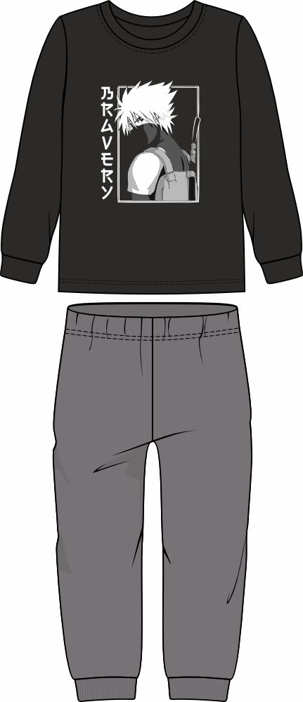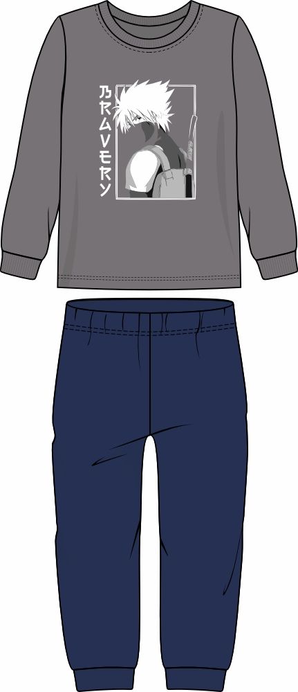 Пижама для мальчика, состоящая из джемпера и брюк. Джемпер прямого силуэта, с втачным длинным рукавом. Горловина круглая обработана обтачкой из рибаны. По низу рукавов манжеты из рибаны. Низ изделия обработан швом вподгибку. На полочке принт Шелкография. Надпись переводится как "Храбрость". Брюки прямого силуэта, из однотонного полотна. Пояс цельнокроенный, с эластичной тесьмой внутри. По низу изделия манжеты из рибаны.