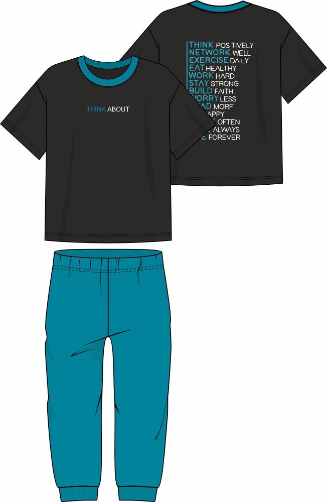 Пижама для мальчика, состоящая из футболки и брюк. Футболка свободного силуэта (оверсайз), с коротким рукавом. Горловина круглая обработана обтачкой из рибаны. Низ изделия и рукава обработан швом вподгибку. На полочке и спинке принт Шелкография. Надпись переводится как "Думайте;Думайте о хорошем;Хорошо общайтесь;Занимайтесь спорто каждый день;Питайтесь здоровой пищей;Усердно работайте;Оставайтесь сильными;Укрепляйте веру; Меньше беспокойтесь;Больше читайте; Будьте счастливы;Чаще отдыхайте;Всегда любите;Живите вечно". Брюки прямого силуэта, из однотонного полотна. Пояс цельнокроенный, с эластичной тесьмой внутри. По низу изделия манжеты из рибаны.