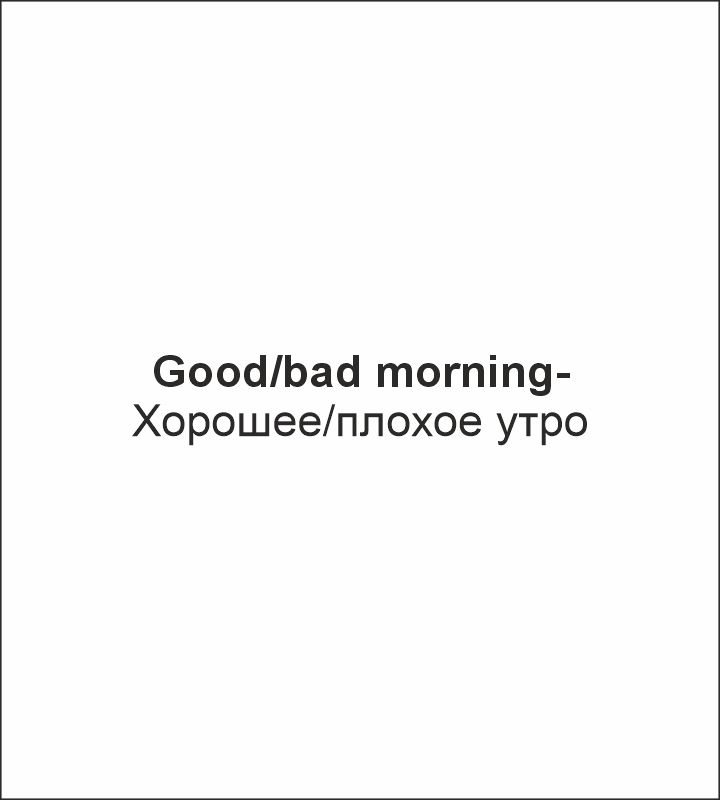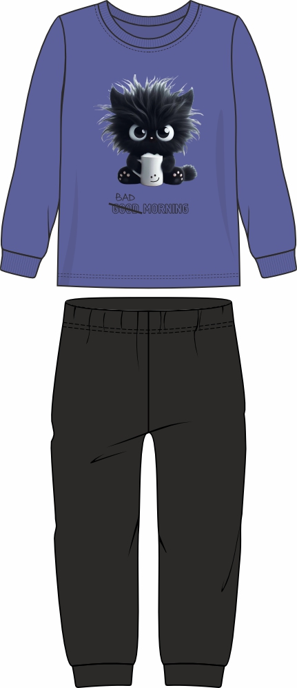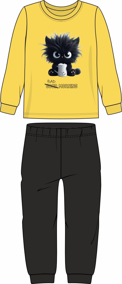 Пижама для мальчика, состоящая из джемпера и брюк. Джемпер прямого силуэта, из однотонного полотна, с втачным длинным рукавом. Горловина круглая обработана обтачкой из рибаны. По низу рукавов манжеты из рибаны. Низ изделия обработан швом вподгибку. На полочке Фотопринт. Надпись переводится как "Хорошее/Плохое утро". Брюки прямого силуэта, из однотонного полотна. Пояс цельнокроенный, с эластичной тесьмой внутри. По низу изделия манжеты из рибаны.
