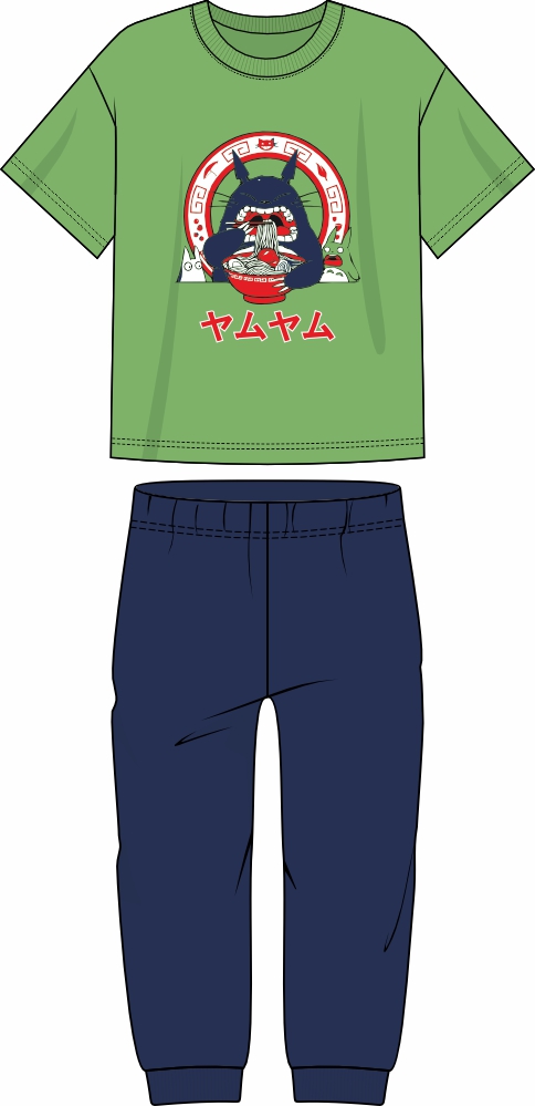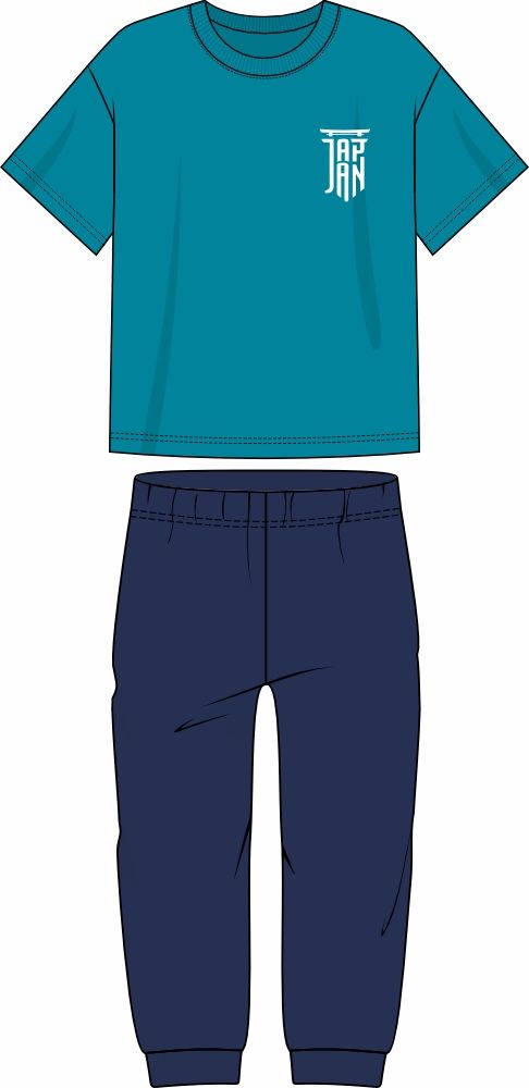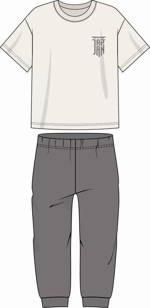 Пижама для мальчика, состоящая из футболки и брюк. Футболка свободного силуэта (оверсайз), с коротким рукавом. Горловина круглая обработана обтачкой из рибаны. Низ изделия и рукава обработан швом вподгибку. На полочке принт Шелкография. Надпись переводится как "Япония". Брюки прямого силуэта, из однотонного полотна. Пояс цельнокроенный, с эластичной тесьмой внутри. По низу изделия манжеты из рибаны.