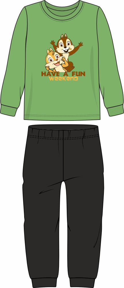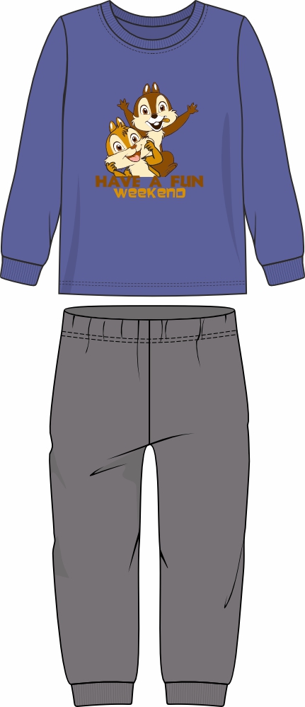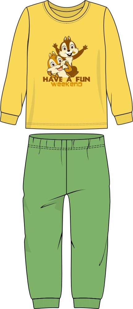 Пижама для мальчика, состоящая из джемпера и брюк. Джемпер прямого силуэта, с втачным длинным рукавом. Горловина круглая обработана обтачкой из рибаны. По низу рукавов манжеты из рибаны. Низ изделия обработан швом вподгибку. На полочке принт Шелкография. Надпись переводится как "Веселых выходных". Брюки прямого силуэта, из однотонного полотна. Пояс цельнокроенный, с эластичной тесьмой внутри. По низу изделия манжеты из рибаны.