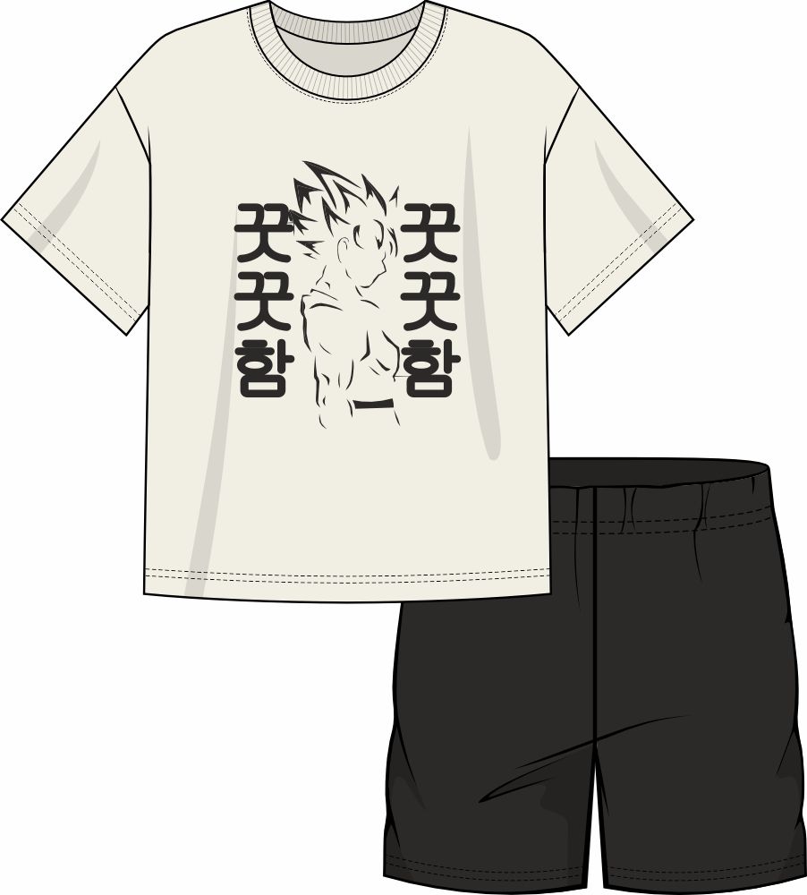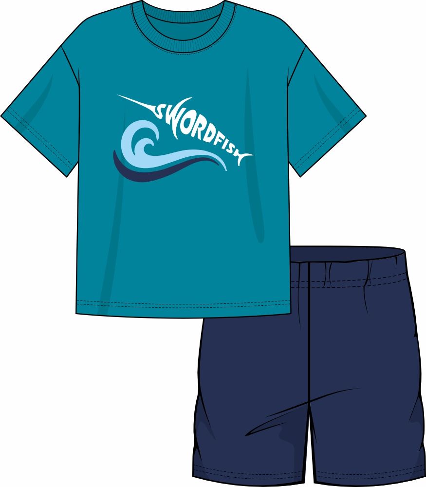 Пижама для мальчика, состоящая из футболки и шорт. Футболка свободного силуэта (оверсайз), с коротким рукавом. Горловина круглая обработана обтачкой из рибаны. Низ изделия и рукава обработан швом вподгибку. На полочке принт Шелкография. Надпись переводится как "Рыба-меч". Шорты прямого силуэта, из однотонного полотна. Пояс цельнокроенный, с эластичной тесьмой внутри. Низ изделия обработан швом вподгибку.