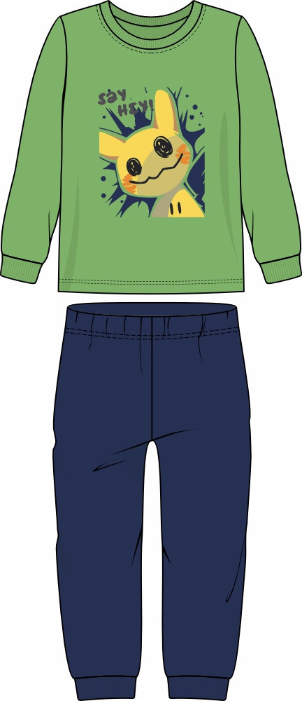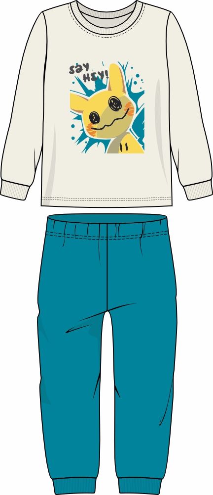 Пижама для мальчика, состоящая из джемпера и брюк. Джемпер прямого силуэта, с втачным длинным рукавом. Горловина круглая обработана обтачкой из рибаны. По низу рукавов манжеты из рибаны. Низ изделия обработан швом вподгибку. На полочке принт Шелкография. Надпись переводится как "Скажи привет". Брюки прямого силуэта, из однотонного полотна. Пояс цельнокроенный, с эластичной тесьмой внутри. По низу изделия манжеты из рибаны.