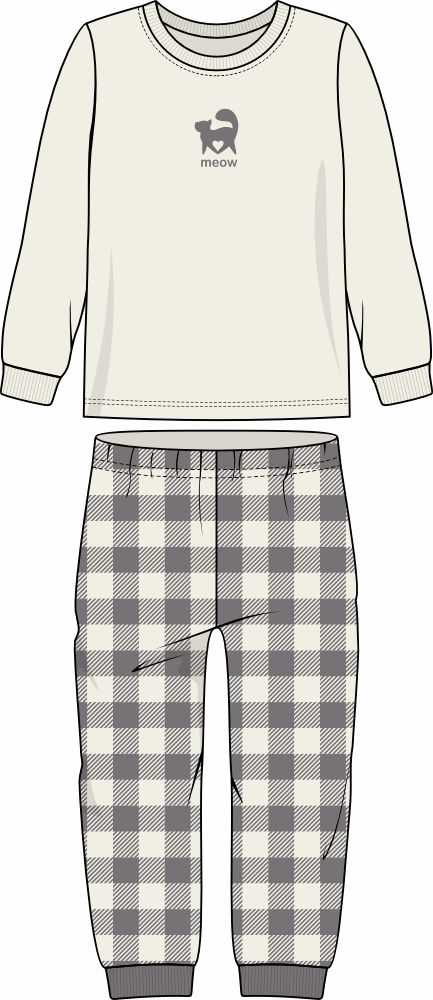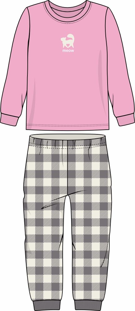 Пижама для девочки, состоящая из джемпера и брюк. Джемпер прямого силуэта, с втачным длинным рукавом. Горловина круглая обработана обтачкой из рибаны. По низу рукавов манжеты из рибаны. Низ изделия обработан швом вподгибку. На полочке принт Шелкография. Надпись переводится как "Мяу". Брюки прямого силуэта, из набивного полотна. Пояс цельнокроенный, с эластичной тесьмой внутри. По низу изделия манжеты из рибаны.