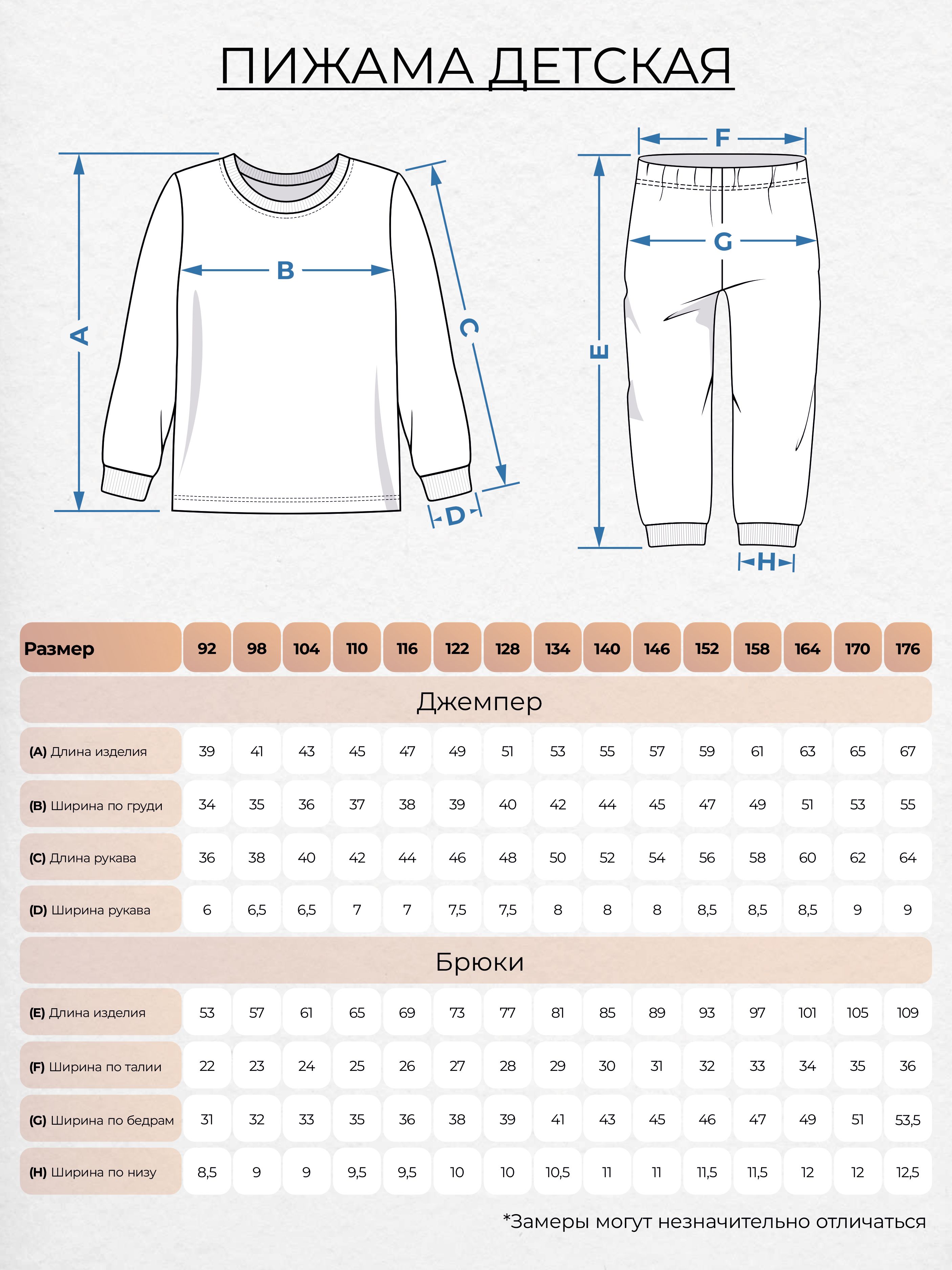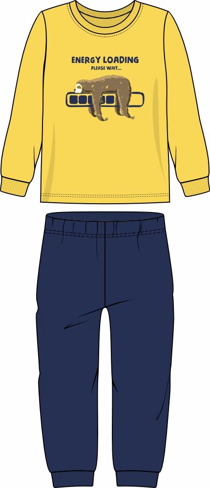 Пижама для мальчика, состоящая из джемпера и брюк. Джемпер прямого силуэта, с втачным длинным рукавом. Горловина круглая обработана обтачкой из рибаны. По низу рукавов манжеты из рибаны. Низ изделия обработан швом вподгибку. На полочке принт Шелкография с флуоресцентной краской. ПРИНТ СВЕТИТСЯ В ТЕМНОТЕ. Надпись переводится как "Загрузка энергии;Пожалуйста подождите". Брюки прямого силуэта, из однотонного полотна. Пояс цельнокроенный, с эластичной тесьмой внутри. По низу изделия манжеты из рибаны.