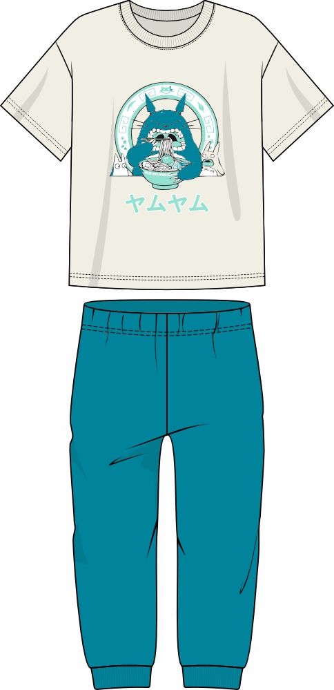 Пижама для мальчика, состоящая из футболки и брюк. Футболка свободного силуэта (оверсайз), с коротким рукавом. Горловина круглая обработана обтачкой из рибаны. Низ изделия и рукава обработан швом вподгибку. На полочке принт Шелкография. Надпись переводится как "Ням-ням". Брюки прямого силуэта, из однотонного полотна. Пояс цельнокроенный, с эластичной тесьмой внутри. По низу изделия манжеты из рибаны.