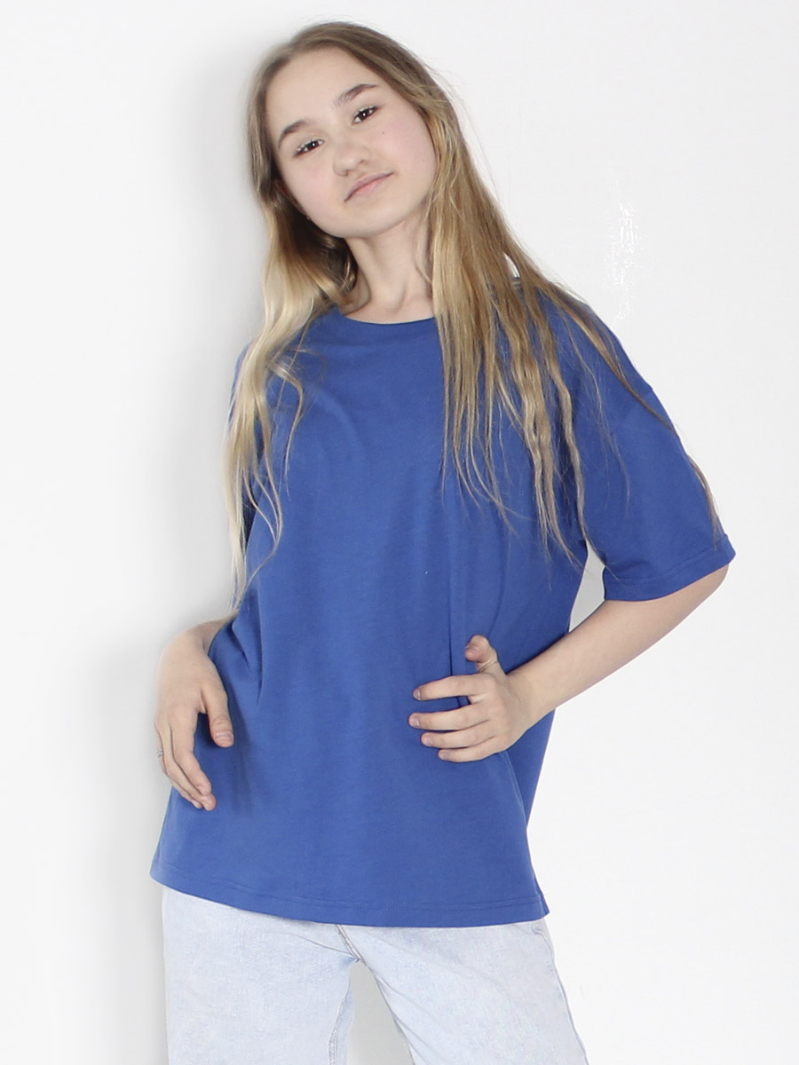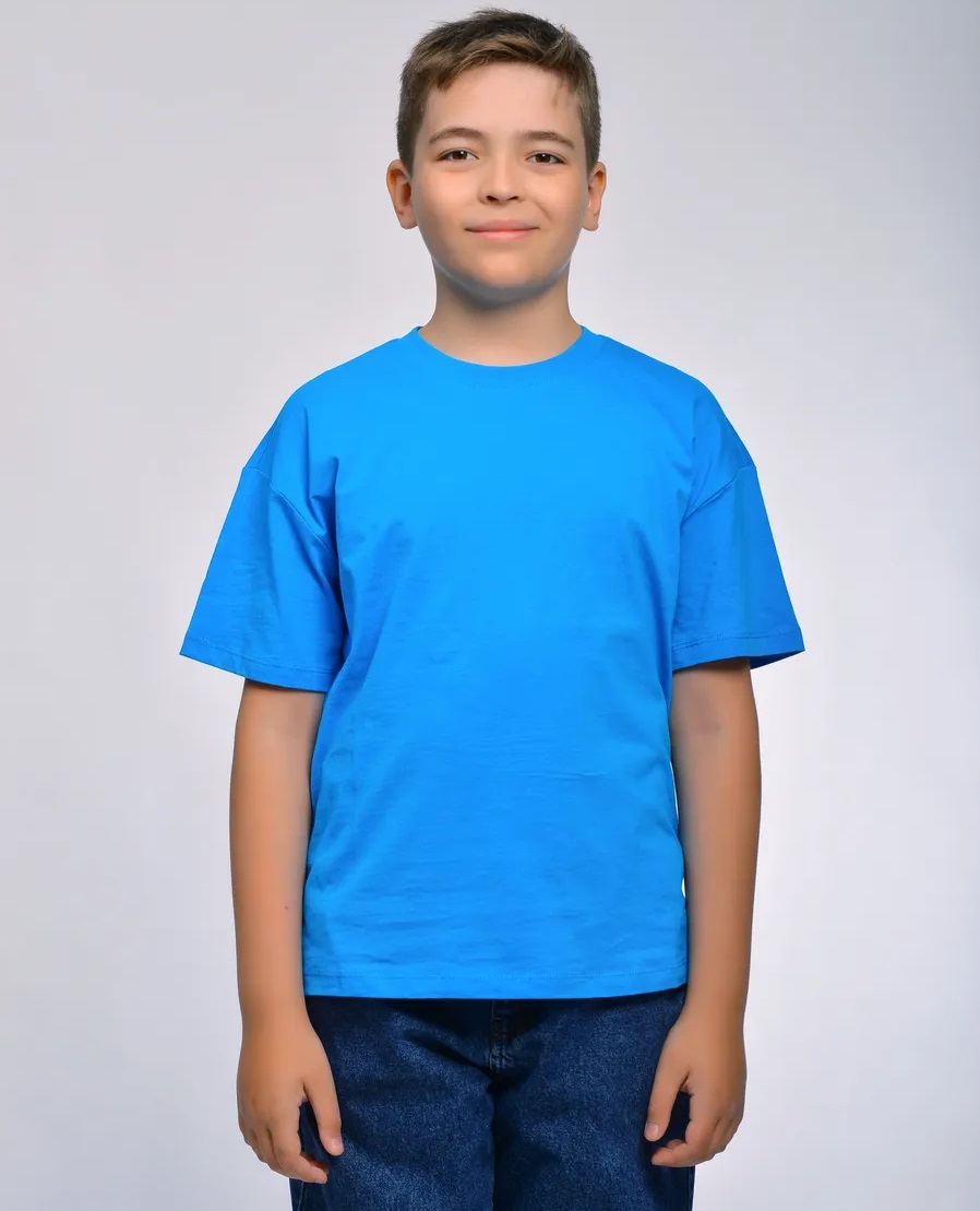 Футболка детская прямого силуэта, крой оверсайз с втачным коротким рукавом. Горловина круглая, обработана воротником из кулирки, в цвет изделия. Горловина спинки внутри обработана настрочной планкой из киперной ленты. Низ рукавов обработан швом вподгибку.