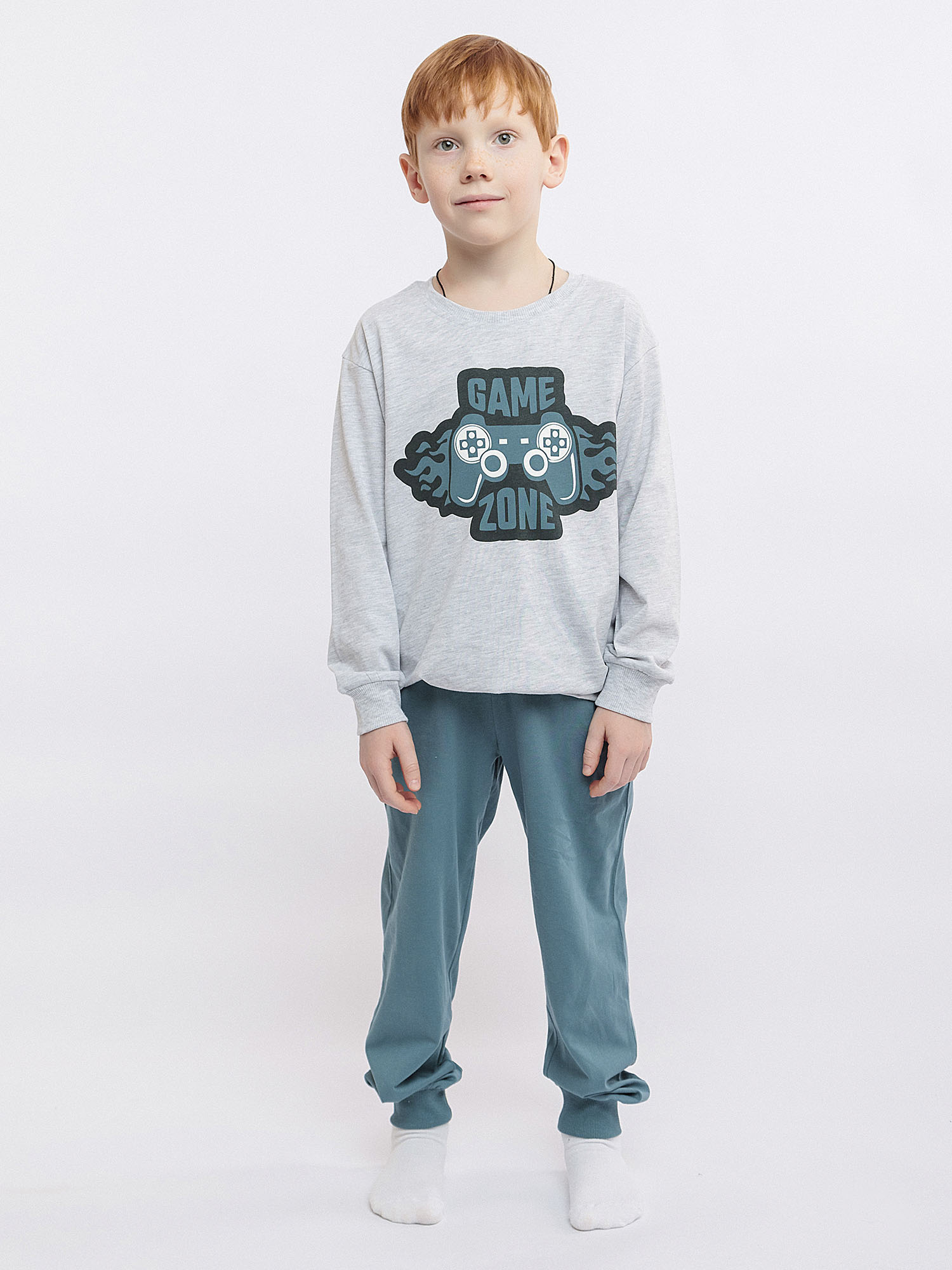 Пижама детская, состоящая из футболки и брюк. Футболка детская свободного силуэта (оверсайз), с коротким рукавом. Горловина круглая, обработана воротником из рибаны. Низ изделия и рукава обработан швом вподгибку. На полочке принт ШЕЛКОГРАФИЯ. Брюки прямого покроя, из набивного полотна. Пояс цельнокроенный, с эластичной тесьмой внутри. Низ изделия обработан швом вподгибку.