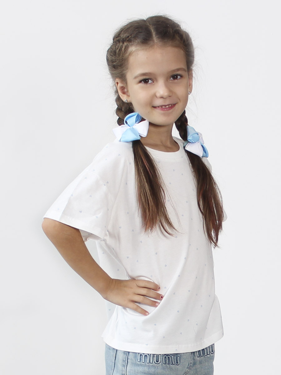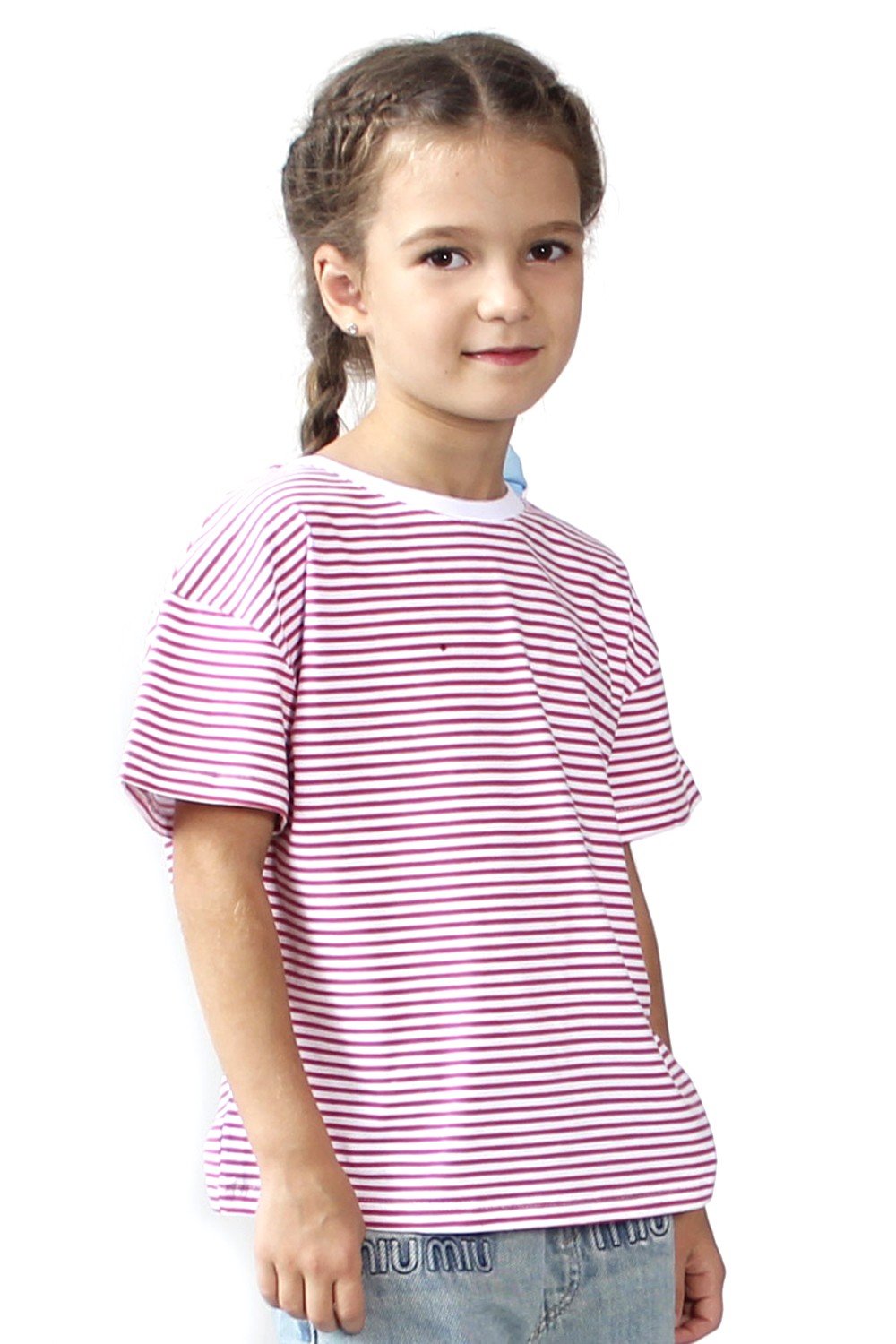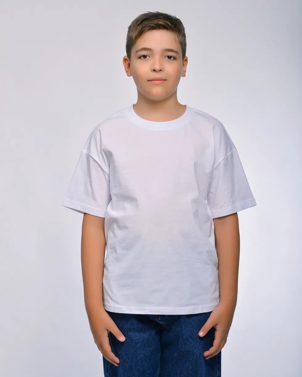 Футболка детская прямого силуэта, крой оверсайз с втачным коротким рукавом. Горловина круглая, обработана воротником из кулирки, в цвет изделия. Горловина спинки внутри обработана настрочной планкой из киперной ленты. Низ рукавов обработан швом вподгибку.