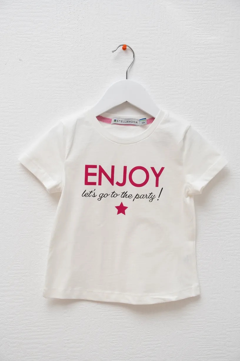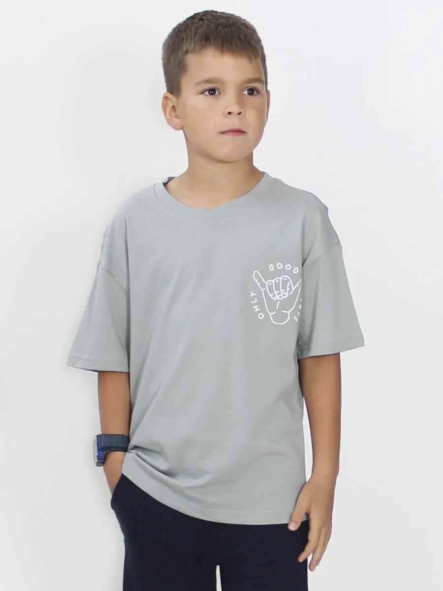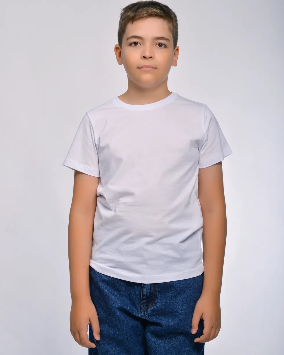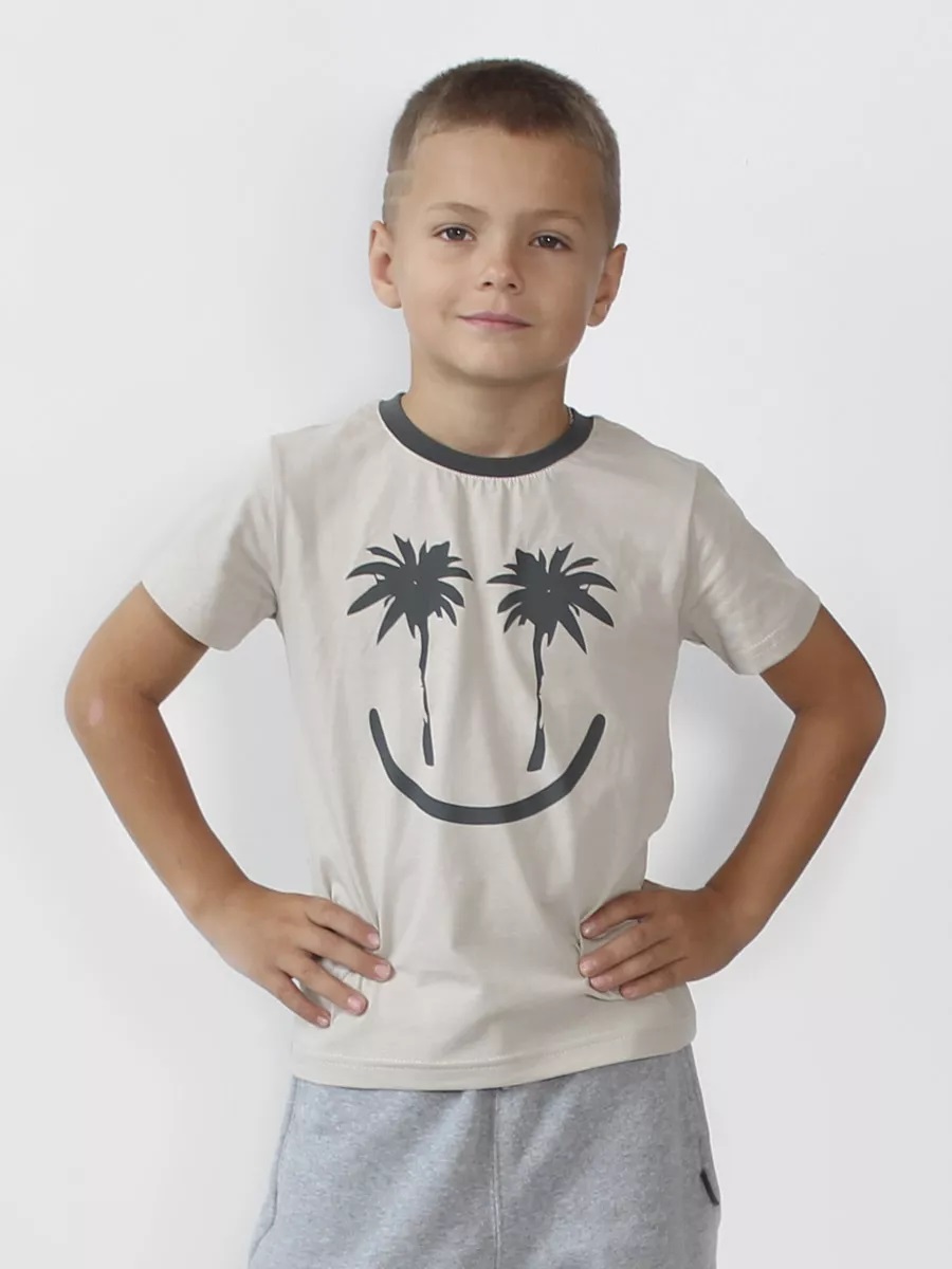 Футболка детская прямого силуэта, крой оверсайз с втачным коротким рукавом. Горловина круглая, обработана воротником из кулирки, в цвет изделия. Горловина спинки внутри обработана настрочной планкой из киперной ленты. Низ рукавов обработан швом вподгибку.