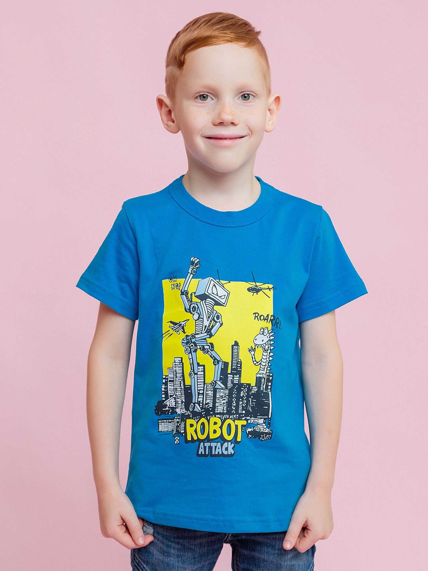 Пижама детская, состоящая из джемпера и брюк. Джемпер прямого силуэта, с втачным длинным рукавом. Горловина круглая, обработана бейкой из рибаны. Спинка, в плечевых швах, переходит на полочку с нахлестом 5см, образуя фигурное закругление к точке основания шеи, по край обработан бейкой из рибаны. По низу рукавов манжеты из рибаны. Низ изделия обработан швом вподгибку. На полочке принт Шелкография. Надпись переводится как "Классный малыш". Брюки прямого силуэта, из однотонного полотна. Пояс цельнокроенный, с эластичной тесьмой внутри. По низу изделия манжеты из рибаны.
