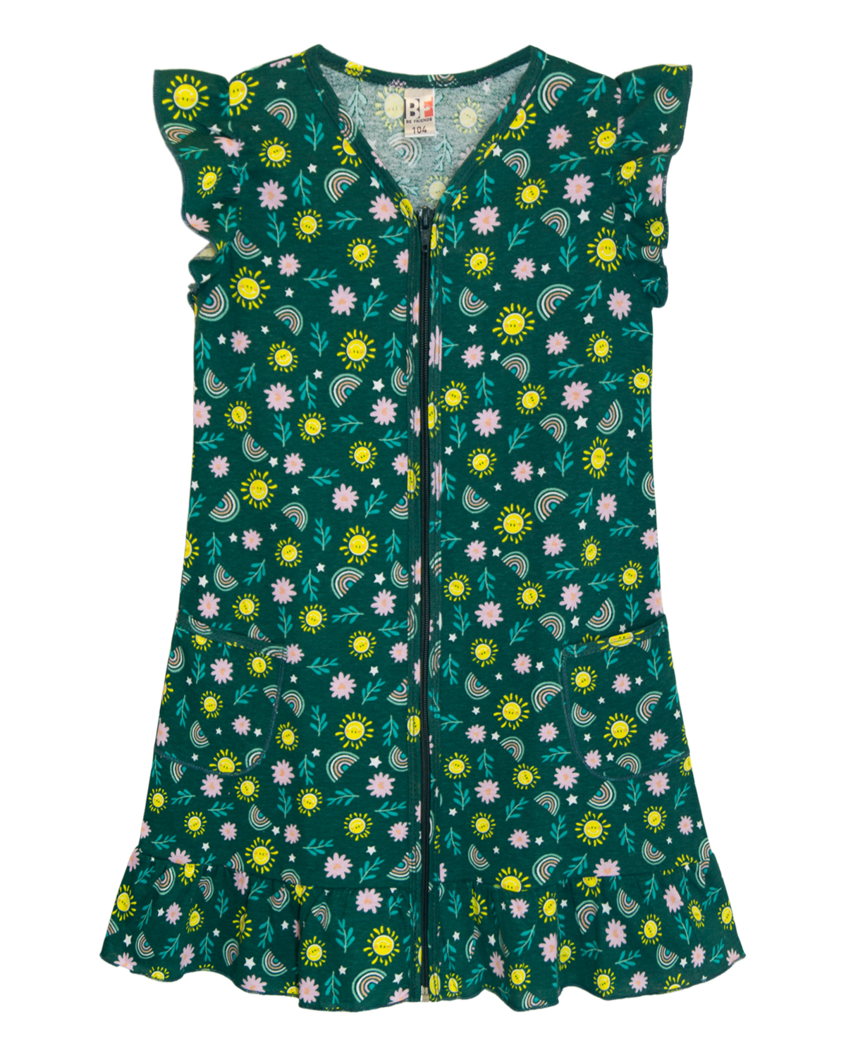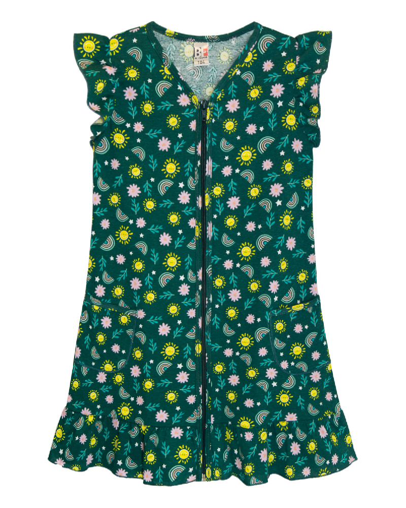 Коллекция наших легких халатов для девочек выполнена из качественной натуральной ткани. Этот халат - мягкий, легкий, почти невесомый, при этом отличается высокой износостойкостью и практичностью, хорошо переносит множественные стирки. Ярко-зеленая ткань с милыми цветочками отлично подойдет для девочек, которые любят природу и насыщенные цвета. Трапециевидный силуэт, изделие изготовлено из кулирки. На замке. Горловина V-образная. Рукава "крылышки" со сборкой. Накладные карманы и рюша по низу изделия.