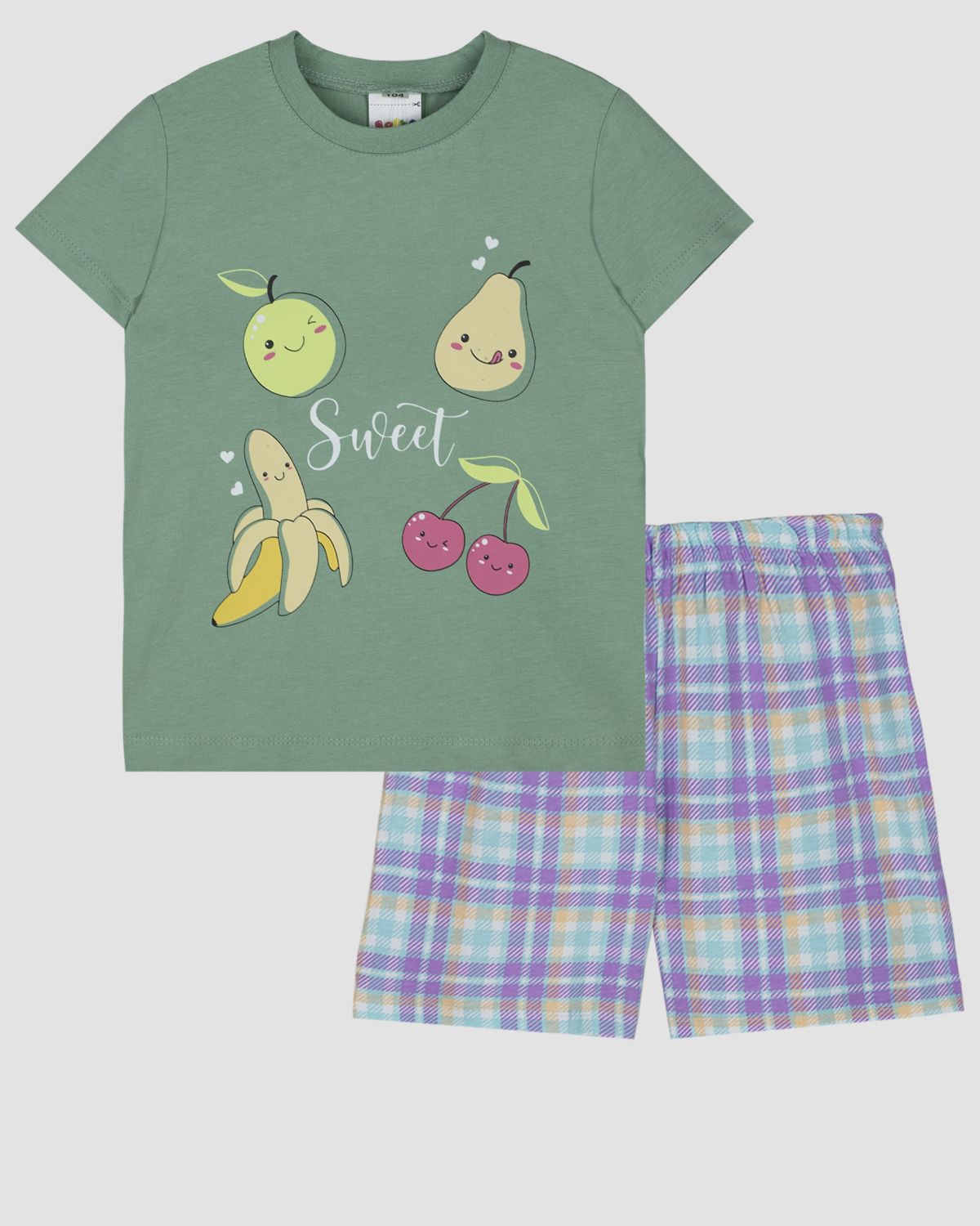 Пижама для девочки, состоящая из футболки и шорт. Футболка прямого силуэта с втачным коротким рукавом. Горловина круглая, обработана воротником из рибаны. По горловине полочки и спинки отделочная строчка. Низ изделия и рукава обработан швом вподгибку. На полочке принт ШЕЛКОГРАФИЯ. Надпись переводится как "Сладкая". Шорты для девочки трапециевидного силуэта из набивного полотна. Пояс цельнокроенный в цвет изделия выполнен из основного полотна с эластичной тесьмой внутри. Низ изделия обработан швом в подгибку.
