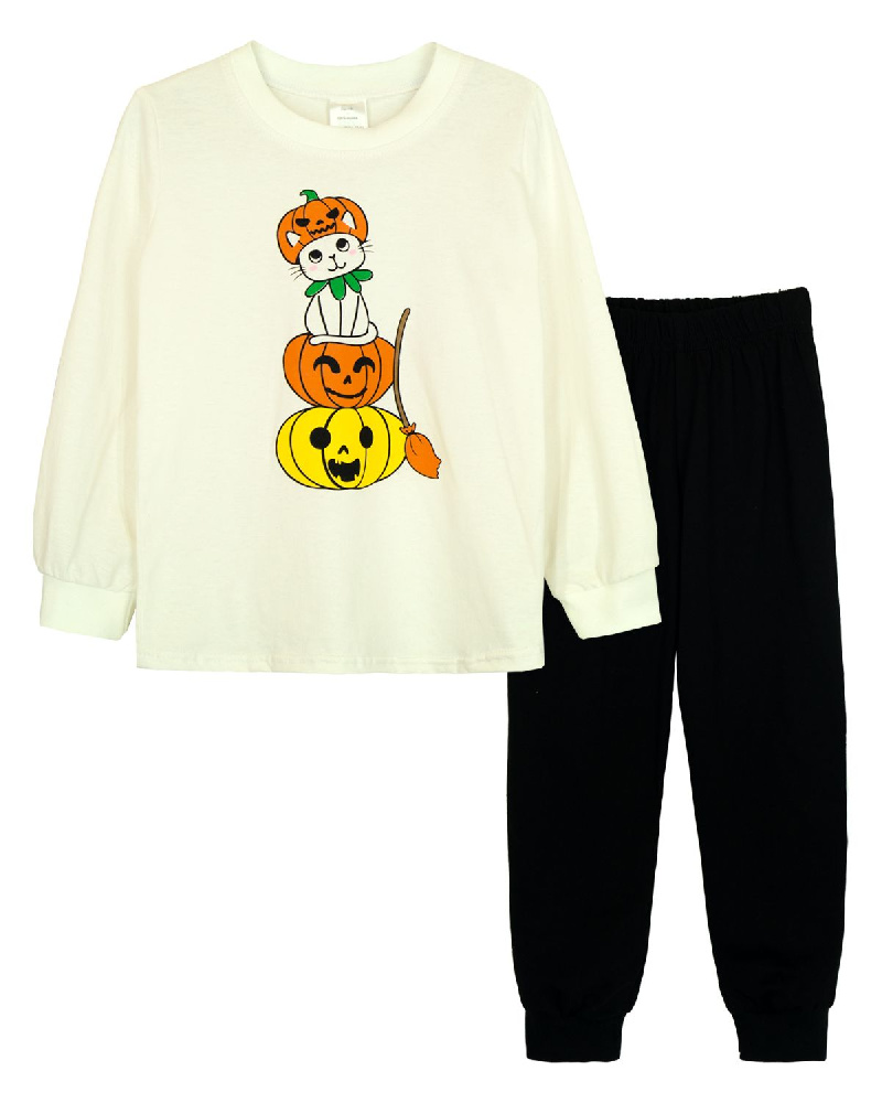 Пижама детская, состоящая из джемпера и брюк. Джемпер прямого силуэта, с в тачным длинным рукавом. Горловина круглая обработана воротником из рибаны, а также по низу рукавов манжеты из рибаны в цвет джемпера. Низ изделия обработан швом в подгибку. На полочке принт шелкография. Брюки прямого покроя, из однотонного полотна. По низу изделия манжеты из рибаны, в цвет брюк. Пояс цельнокроеный, с эластичной тесьмой внутри.