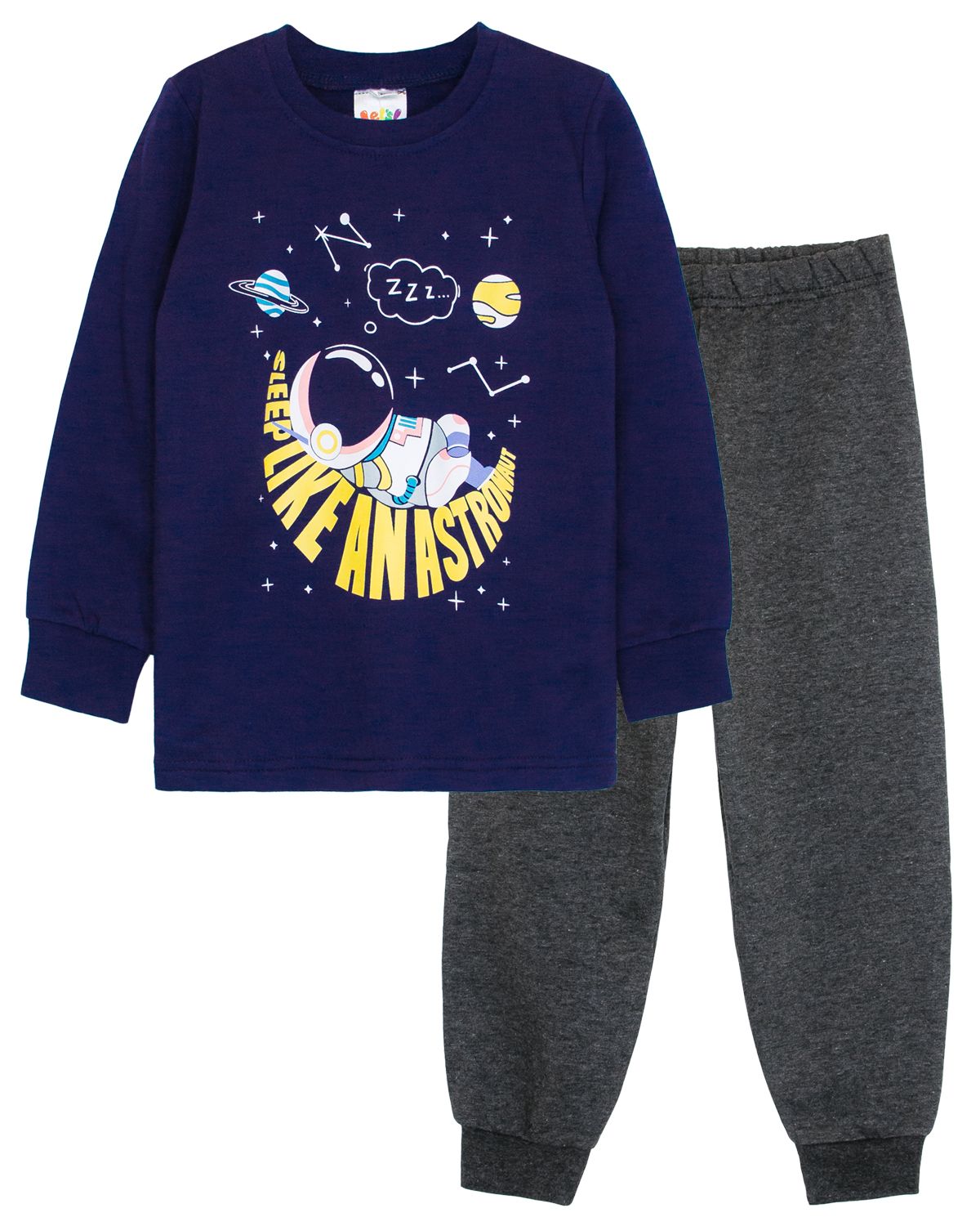 Пижама для мальчика, состоящая из джемпера и брюк. Джемпер прямого силуэта с втачным длинным рукавом. Горловина круглая, окантована рибаной. По низу рукавов манжеты из рибаны. Низ изделия обработан швом в подгибку. На полочке принт шелкография. Брюки прямого покроя, из однотонного полотна. Пояс цельнокроенный, с эластичной тесьмой внутри. По низу изделия манжеты из рибаны.