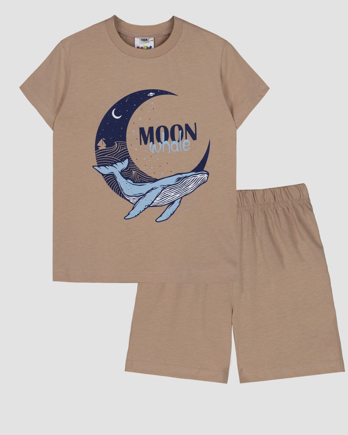 Пижама для мальчика, состоящая из футболки и шорт. Футболка прямого силуэта с втачным коротким рукавом. Горловина круглая, обработана воротником из рибаны. По горловине полочки и спинки отделочная строчка. Низ изделия и рукава обработан швом вподгибку. На полочке принт ШЕЛКОГРАФИЯ. Надпись переводится как "Лунный кит". Шорты для мальчика прямого силуэта из однотонного полотна. Пояс отрезной в цвет изделия, выполнен из основного полотна с эластичной тесьмой внутри. На передних половинках шорт выполнены карманы с отрезным бочком. Низ изделия обработан швом в подгибку.
