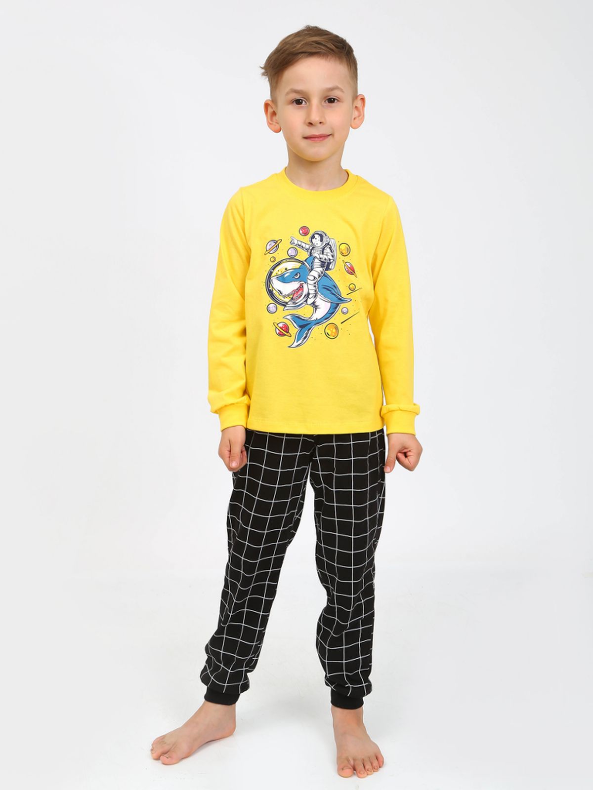 Пижама из тонкой хлопковой ткани. Джемпер прямого силуэта, с втачными рукавами на манжетах. Горловина отделана обтачкой. Брюки прямые на манжетах, пояс цельнокроеный на резинке. Манжеты рукавов, брюк, а также обтачка горловины выполнены из эластичной ткани. Ткань мягкая, гипоаллергенная, хорошо пропускает воздух.