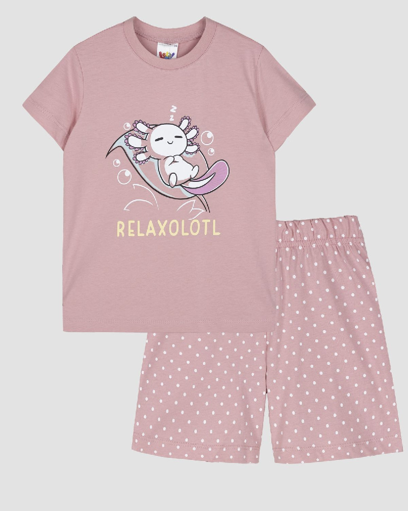 Пижама для девочки, состоящая из футболки и шорт. Футболка прямого силуэта с втачным коротким рукавом. Горловина круглая, обработана воротником из рибаны. По горловине полочки и спинки отделочная строчка. Низ изделия и рукава обработан швом вподгибку. На полочке принт ШЕЛКОГРАФИЯ. Шорты для девочки трапециевидного силуэта из набивного полотна. Пояс цельнокроенный в цвет изделия выполнен из основного полотна с эластичной тесьмой внутри. Низ изделия обработан швом в подгибку.