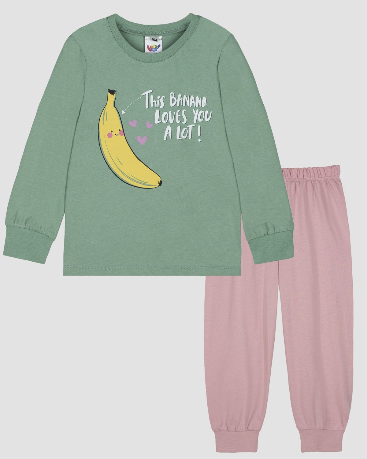 Пижама для девочки, состоящая из джемпера и брюк. Джемпер прямого силуэта с втачным длинным рукавом. Горловина круглая, обработана воротником из рибаны. По горловине полочки и спинки отделочная строчка. По низу рукавов манжеты из рибаны. Низ изделия обработан швом в подгибку. На полочке принт ШЕЛКОГРАФИЯ. Надпись переводится как "Это банан тебя очень любит!". Брюки для девочки прямого силуэта, из однотонного полотна. Пояс цельнокроенный, с эластичной тесьмой внутри. По низу изделия манжеты из рибаны.