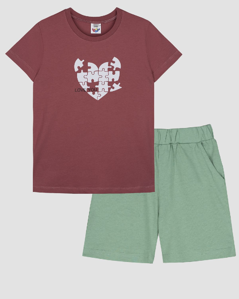 Пижама для девочки, состоящая из футболки и шорт. Футболка прямого силуэта с втачным коротким рукавом. Горловина круглая, обработана воротником из рибаны. По горловине полочки и спинки отделочная строчка. Низ изделия и рукава обработан швом вподгибку. На полочке принт ШЕЛКОГРАФИЯ. Надпись переводится как "Люблю тебя". Шорты для девочки трапециевидного силуэта из однотонного полотна. Пояс отрезной в цвет изделия, выполнен из основного полотна с эластичной тесьмой внутри. На передних половинках шорт выполнены карманы с отрезным бочком. Низ изделия обработан швом в подгибку.