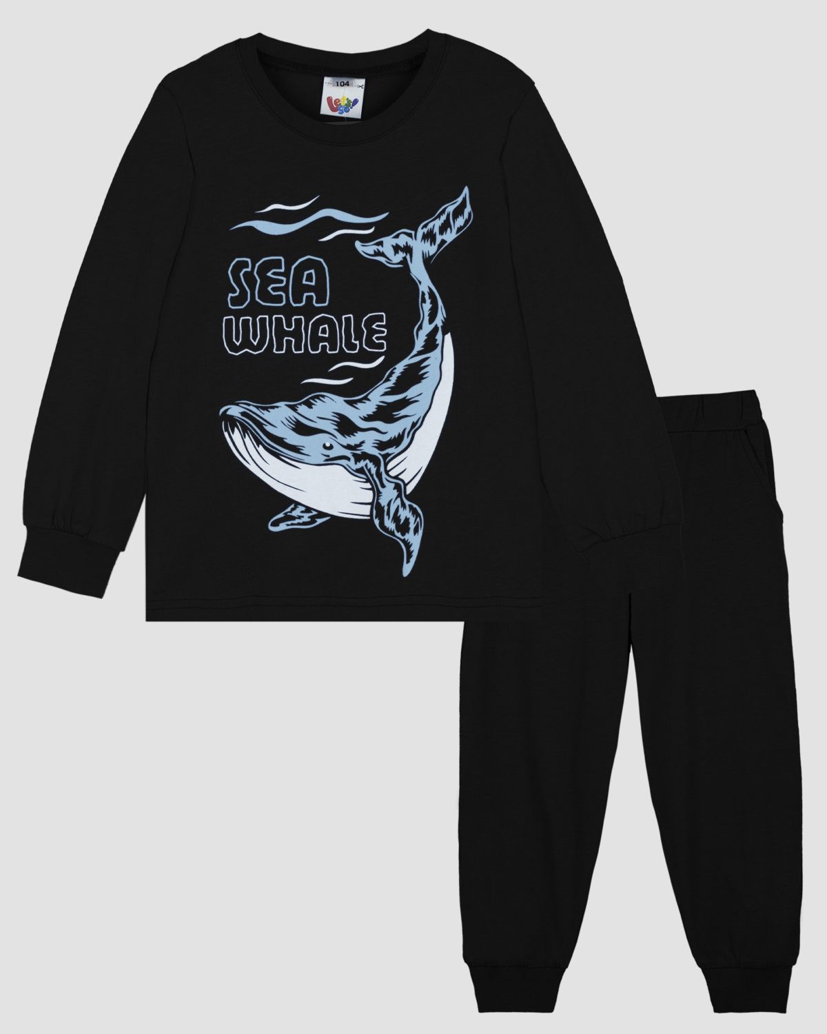 Пижама для мальчика, состоящая из джемпера и брюк. Джемпер прямого силуэта с втачным длинным рукавом. Горловина круглая, обработана воротником из рибаны. По горловине полочки и спинки отделочная строчка. По низу рукавов манжеты из рибаны. Низ изделия обработан швом в подгибку. На полочке принт ШЕЛКОГРАФИЯ. Надпись переводится как "Море, кит". Брюки для мальчика прямого силуэта из однотонного полотна. Пояс отрезной в цвет изделия, выполнен из основного полотна с эластичной тесьмой внутри. На передних половинках шорт выполнены карманы с отрезным бочком. По низу изделия манжеты из рибаны.
