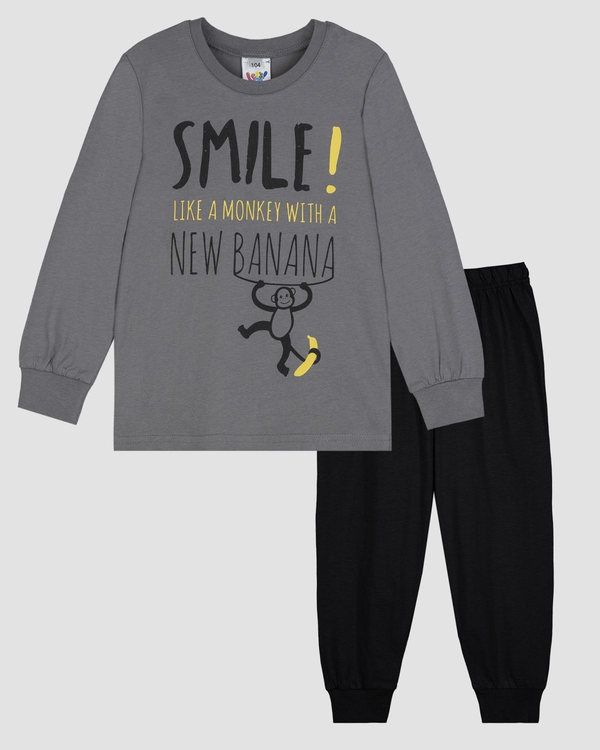 Пижама для мальчика, состоящая из джемпера и брюк. Джемпер прямого силуэта с втачным длинным рукавом. Горловина круглая, обработана воротником из рибаны. По горловине полочки и спинки отделочная строчка. По низу рукавов манжеты из рибаны. Низ изделия обработан швом в подгибку. На полочке принт ШЕЛКОГРАФИЯ. Надпись переводится как "Улыбайся, как обезьянка с новым бананом". Брюки для мальчика прямого силуэта из однотонного полотна. Пояс цельнокроенный с эластичной тесьмой внутри. По низу изделия манжеты из рибаны.