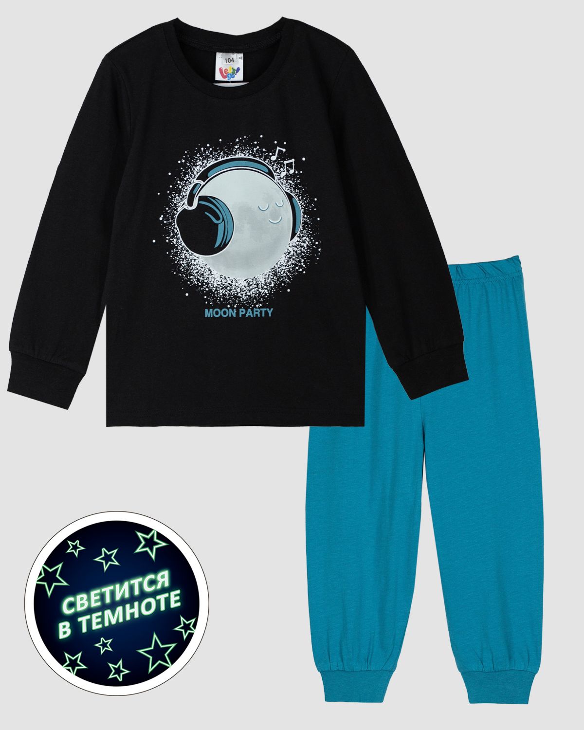 Пижама для мальчика, состоящая из джемпера и брюк. Джемпер прямого силуэта с втачным длинным рукавом. Горловина круглая, обработана воротником из рибаны. По горловине полочки и спинки отделочная строчка. По низу рукавов манжеты из рибаны. Низ изделия обработан швом в подгибку. На полочке принт ШЕЛКОГРАФИЯ С ФЛУОРЕСЦЕНТНОЙ КРАСКОЙ. Надпись переводится как "Лунная вечеринка". Брюки для мальчика прямого силуэта из однотонного полотна. Пояс цельнокроенный с эластичной тесьмой внутри. По низу изделия манжеты из рибаны. ПРИНТ СВЕТИТСЯ В ТЕМНОТЕ.