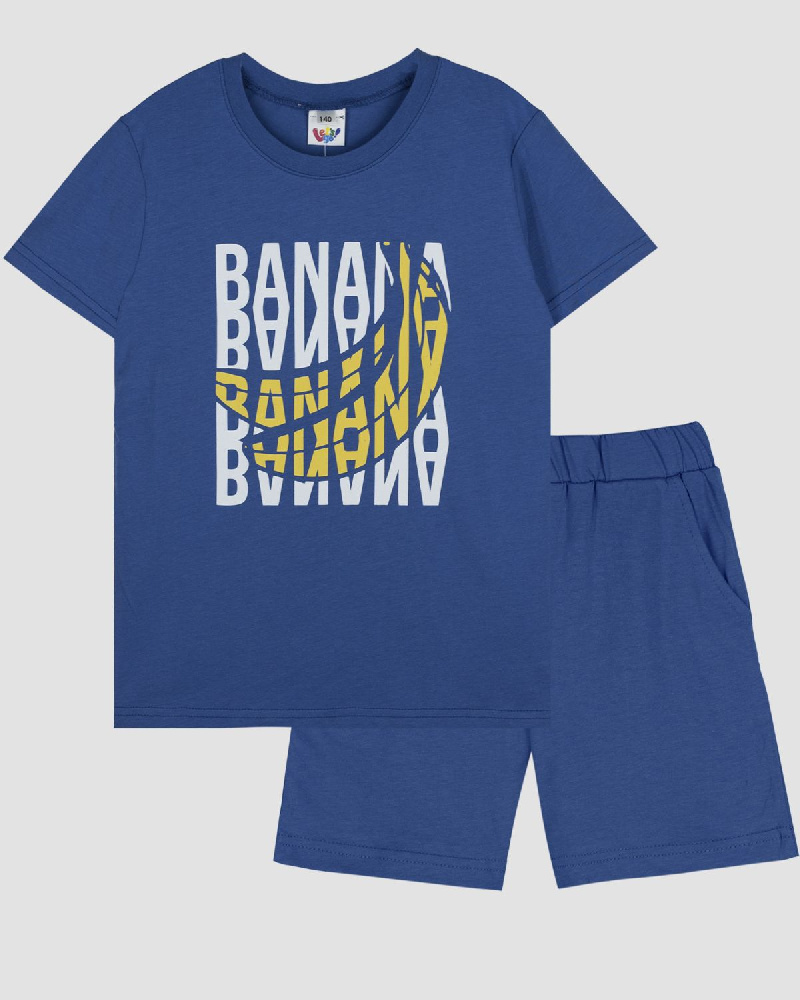 Пижама для мальчика, состоящая из футболки и шорт. Футболка прямого силуэта с втачным коротким рукавом. Горловина круглая, обработана воротником из рибаны. По горловине полочки и спинки отделочная строчка. Низ изделия и рукава обработан швом вподгибку. На полочке принт ШЕЛКОГРАФИЯ. Надпись переводится как "Банан". Шорты для мальчика прямого силуэта из однотонного полотна. Пояс отрезной в цвет изделия, выполнен из основного полотна, с эластичной тесьмой внутри. На передних половинках шорт выполнены карманы с отрезным бочком. Низ изделия обработан швом в подгибку.