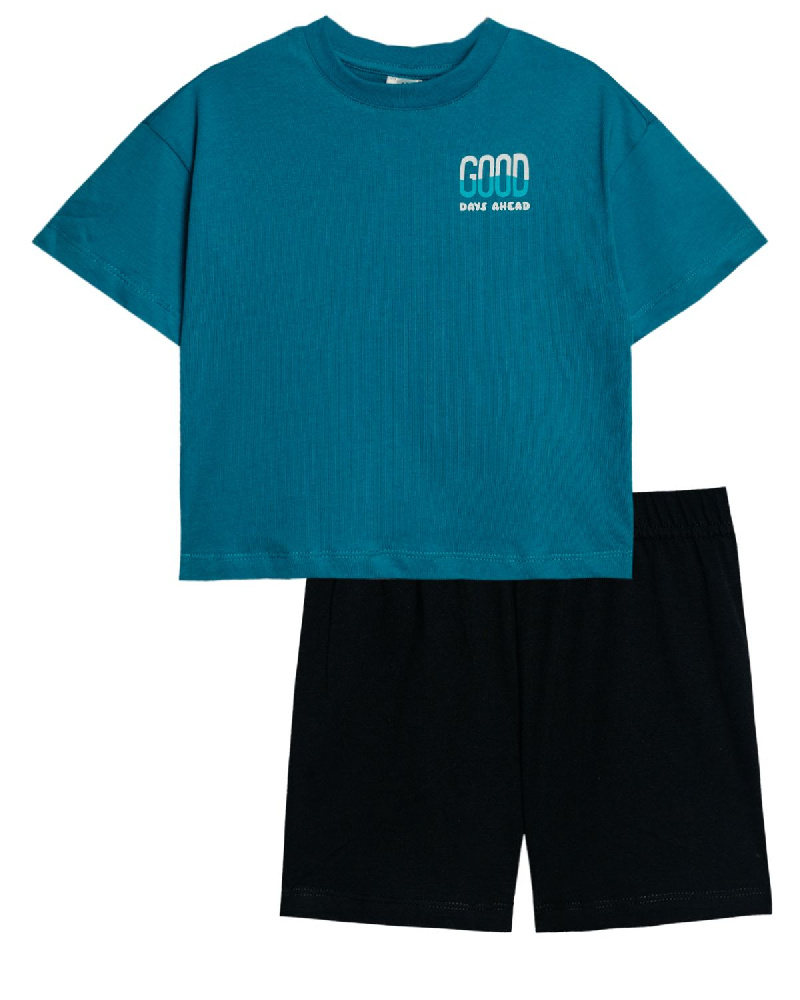 Пижама для мальчика, состоящая из футболки и шорт. Футболка свободного силуэта (оверсайз), с коротким рукавом. Горловина круглая обработана обтачкой из рибаны. Низ изделия и рукава обработан швом вподгибку. На полочке принт Шелкография. Надпись переводится как "Впереди хорошие дни". Шорты прямого силуэта, из однотонного полотна. Пояс цельнокроенный, с эластичной тесьмой внутри. Низ изделия обработан швом вподгибку.
