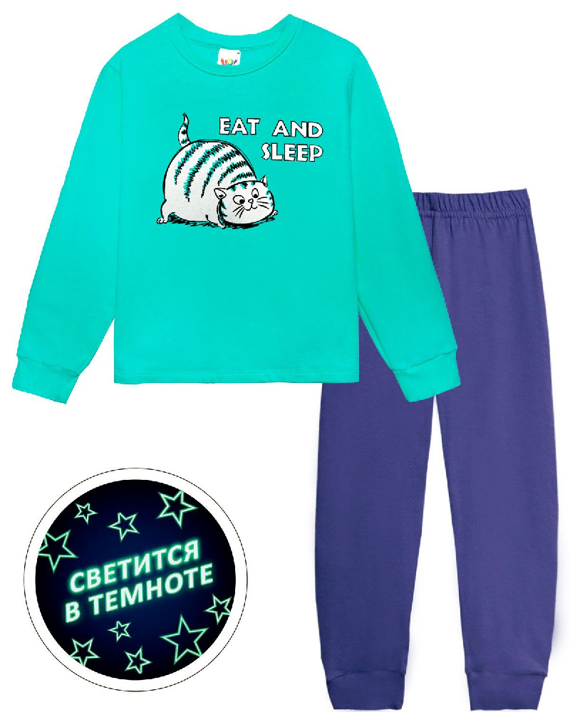 Пижама детская, состоящая из джемпера и брюк. Джемпер прямого силуэта, из однотонного полотна, с втачным длинным рукавом. Горловина круглая обработана обтачкой из рибаны. По низу рукавов манжеты из рибаны. Низ изделия обработан швом вподгибку. На полочке принт Шелкография с флуоресцентной краской. ПРИНТ СВЕТИТСЯ В ТЕМНОТЕ. Надпись переводится как "Кушать и спать". Брюки прямого силуэта, из однотонного полотна. Пояс цельнокроенный, с эластичной тесьмой внутри. По низу изделия манжеты из рибаны.