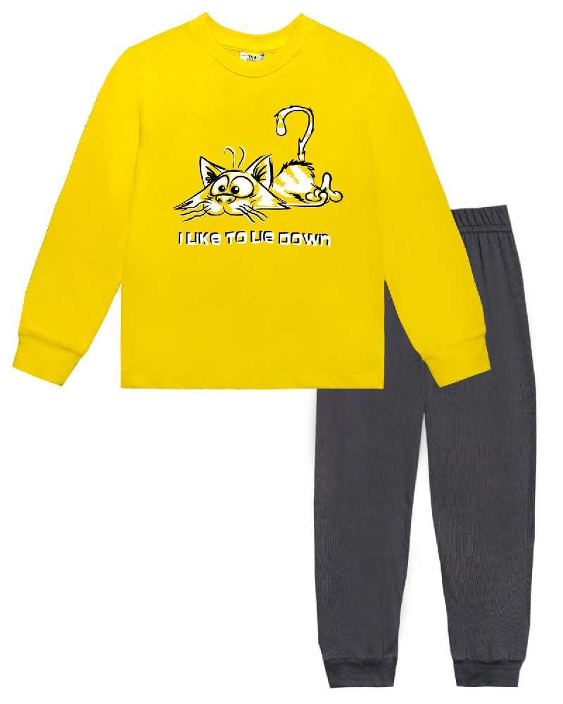 Пижама детская, состоящая из джемпера и брюк. Джемпер прямого силуэта, с втачным длинным рукавом. Горловина круглая обработана обтачкой из рибаны. По низу рукавов манжеты из рибаны. Низ изделия обработан швом вподгибку. На полочке принт Шелкография с флуоресцентной краской. ПРИНТ СВЕТИТСЯ В ТЕМНОТЕ. Надпись переводится как "Я люблю лежать". Брюки прямого силуэта, из однотонного полотна. Пояс цельнокроенный, с эластичной тесьмой внутри. По низу изделия манжеты из рибаны.